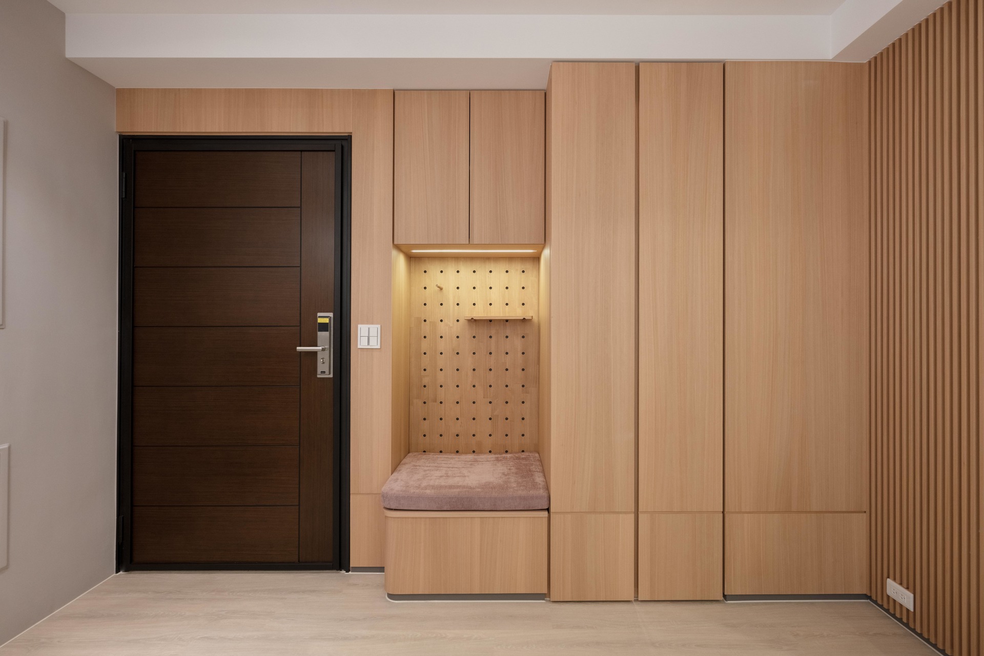 在穿鞋椅區域也設計了幾乎滿牆的收納櫃,但其實更像是儲藏室。
