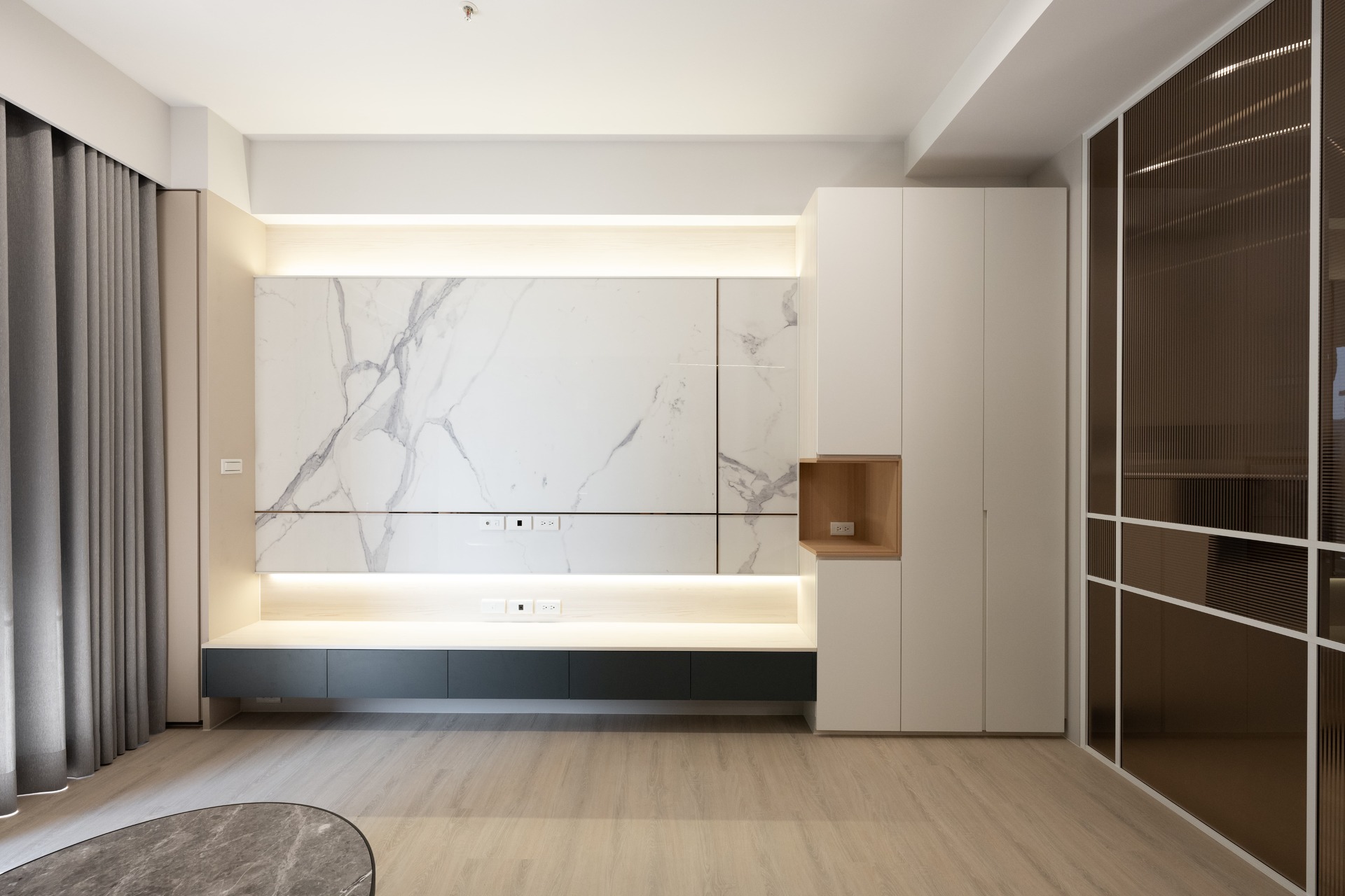 特別值得一提:原本靠窗簾面包覆的區域,多數人以為是根平凡的柱子,實際上是隱藏櫃設計,多了收納的功能。