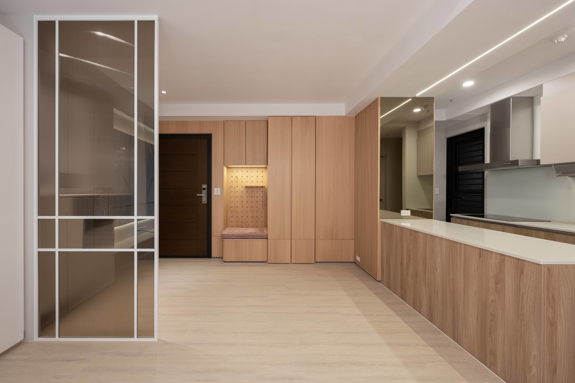 其空間之大,可以放下大型行李、吸塵器等家電。同時為了呼應北歐風格的清新感受,也利用原木材質,從大門入口一直延伸到餐廳,打造室內輕盈、清新的感受。