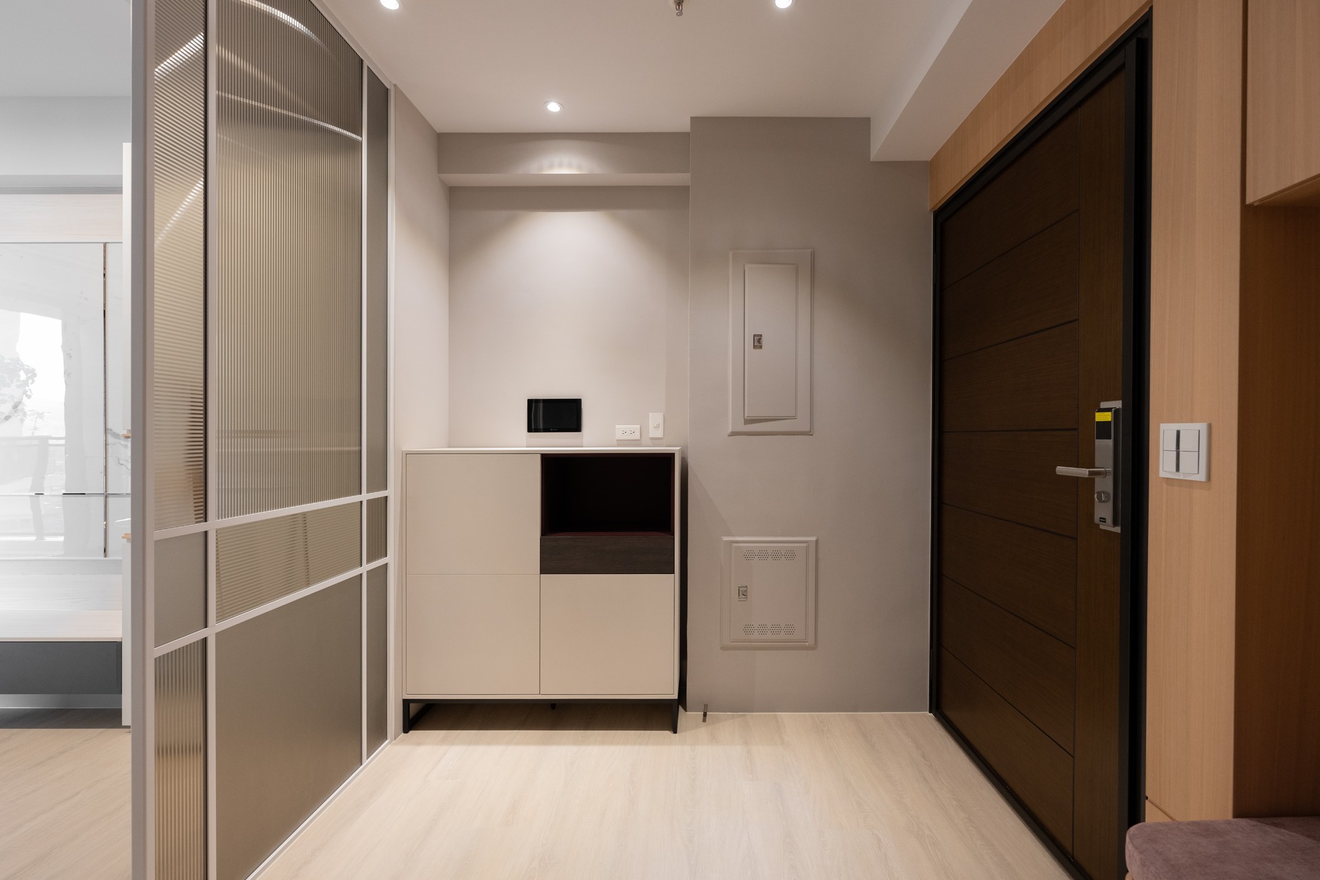 並將總開關箱金屬蓋板也進行噴漆,與牆壁配色融為一體,視覺上看起來更舒適。