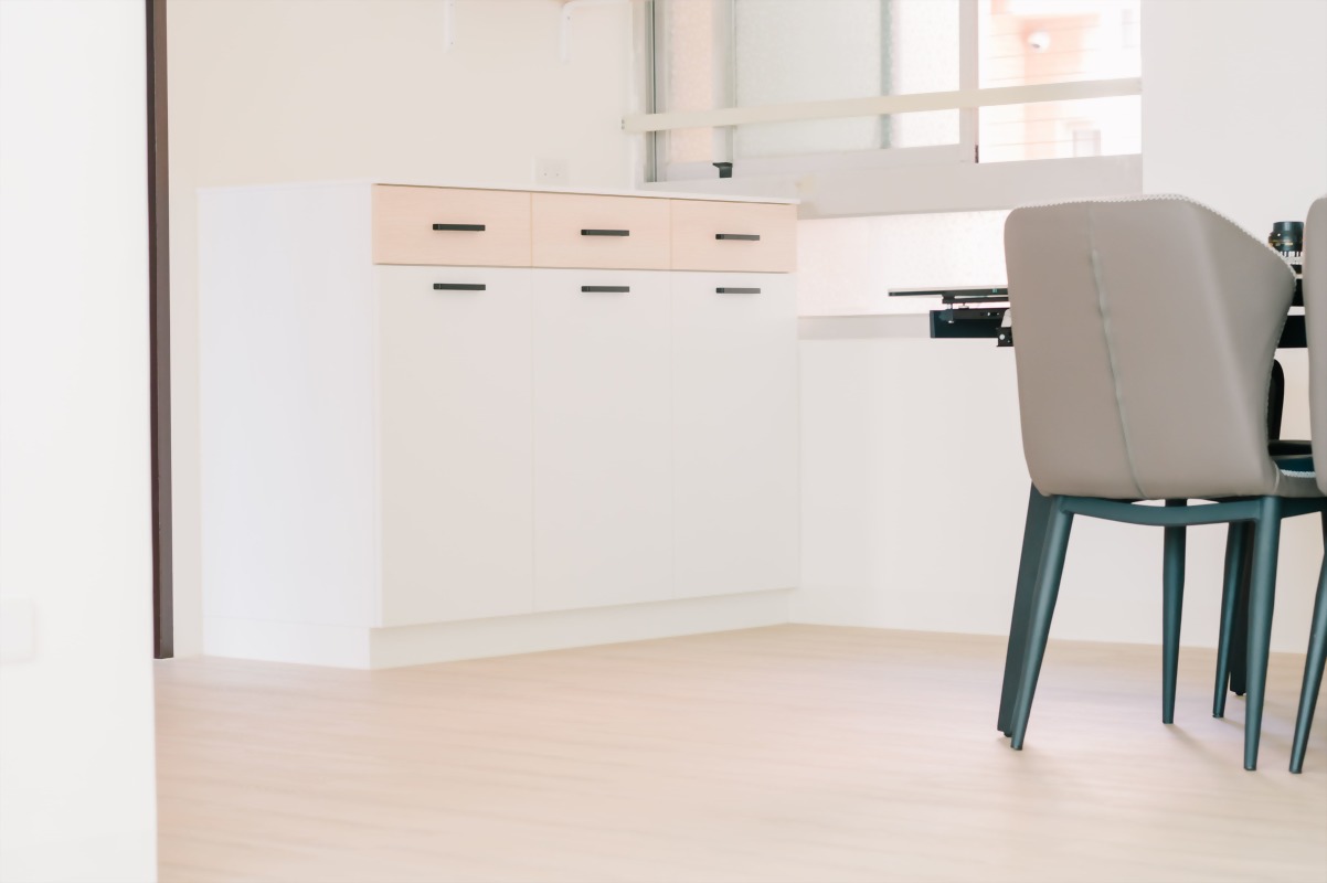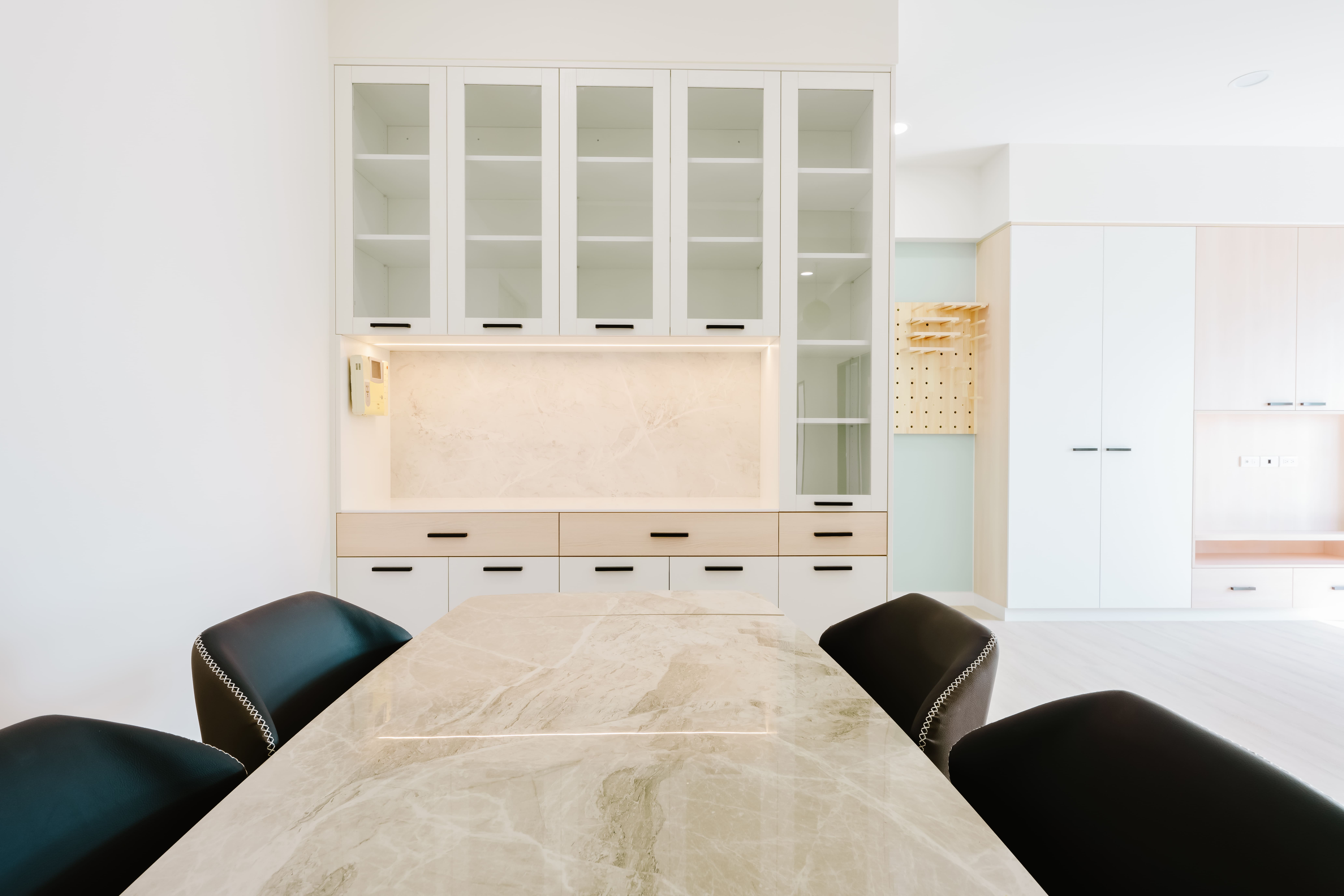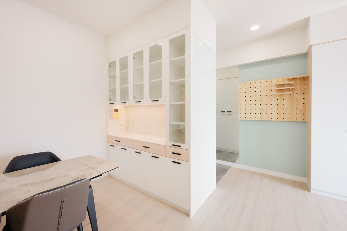 另外為了讓廚房在動線使用上更順利,也一併規劃了餐櫃及電器櫃,在插座及迴路上也依照需求做調整、設備也協助全面更新。