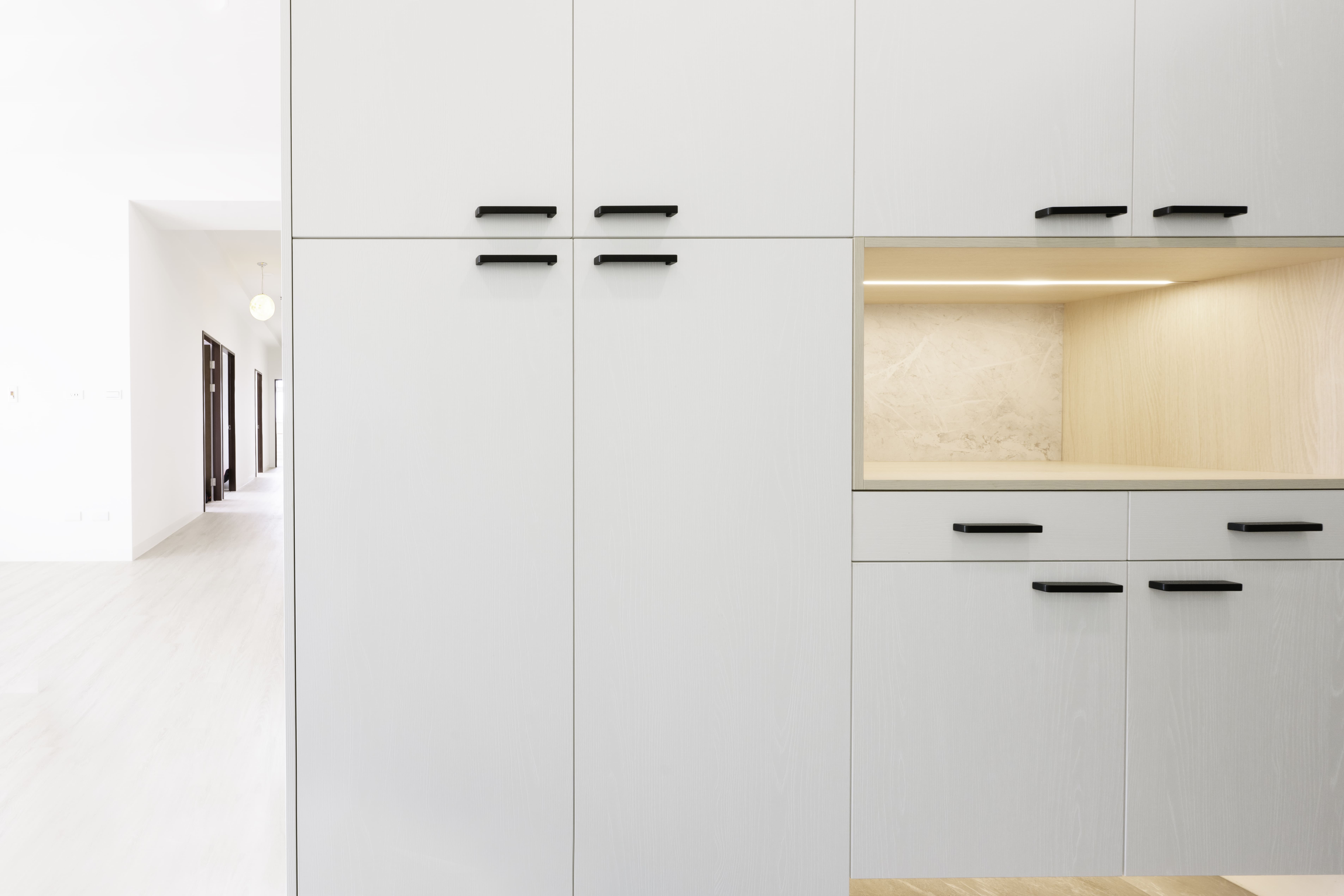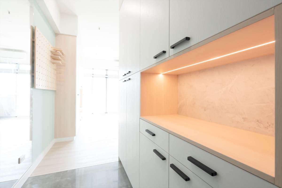 在玄關櫃的部份,也一一設計了懸空的鞋櫃設計、便於收納隱藏雜物的抽屜,也設計了置物平台可以擺放郵件及鑰匙雜物等,別忘了貼心的燈光照明,也是營造回家溫馨氛圍的重要推手。