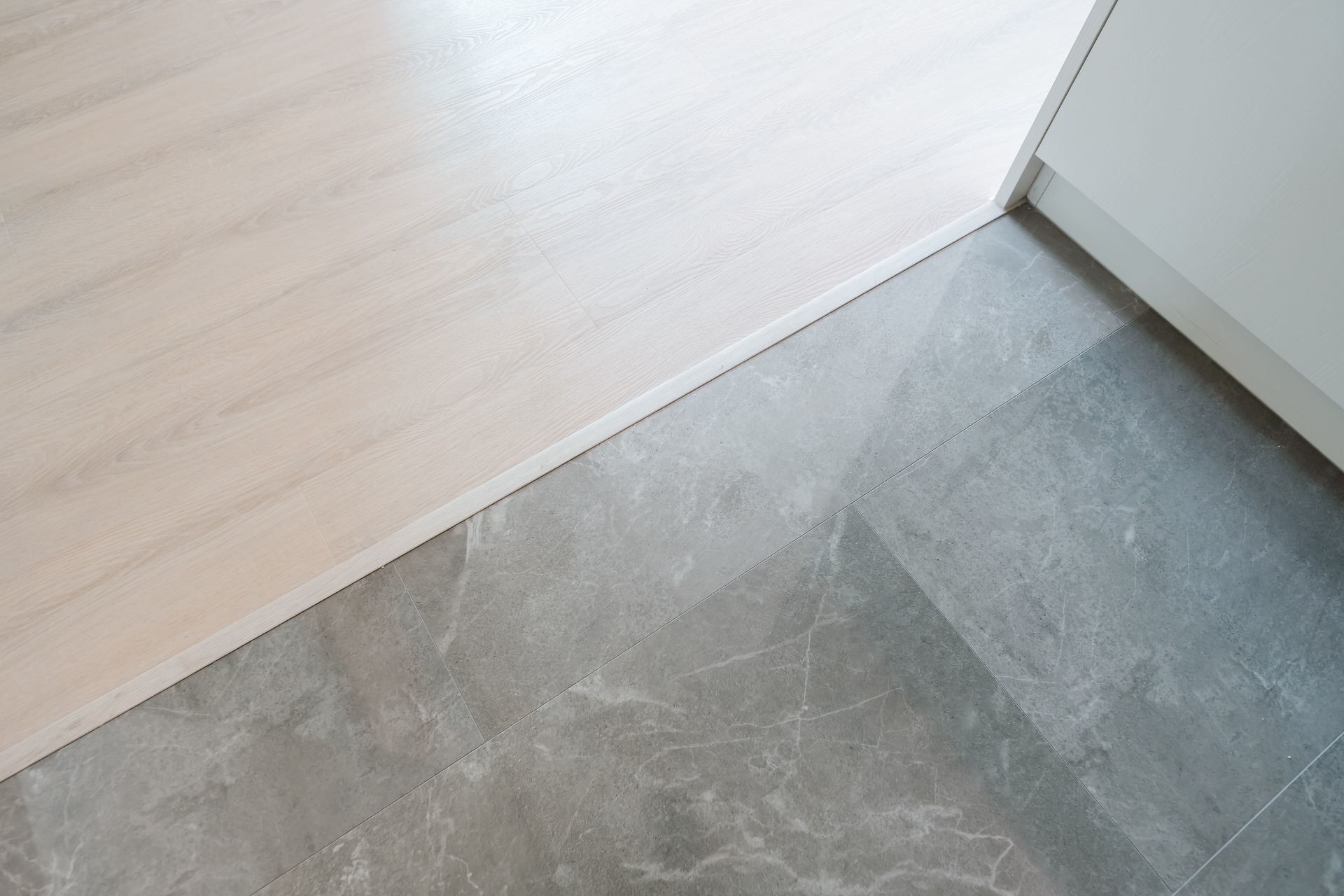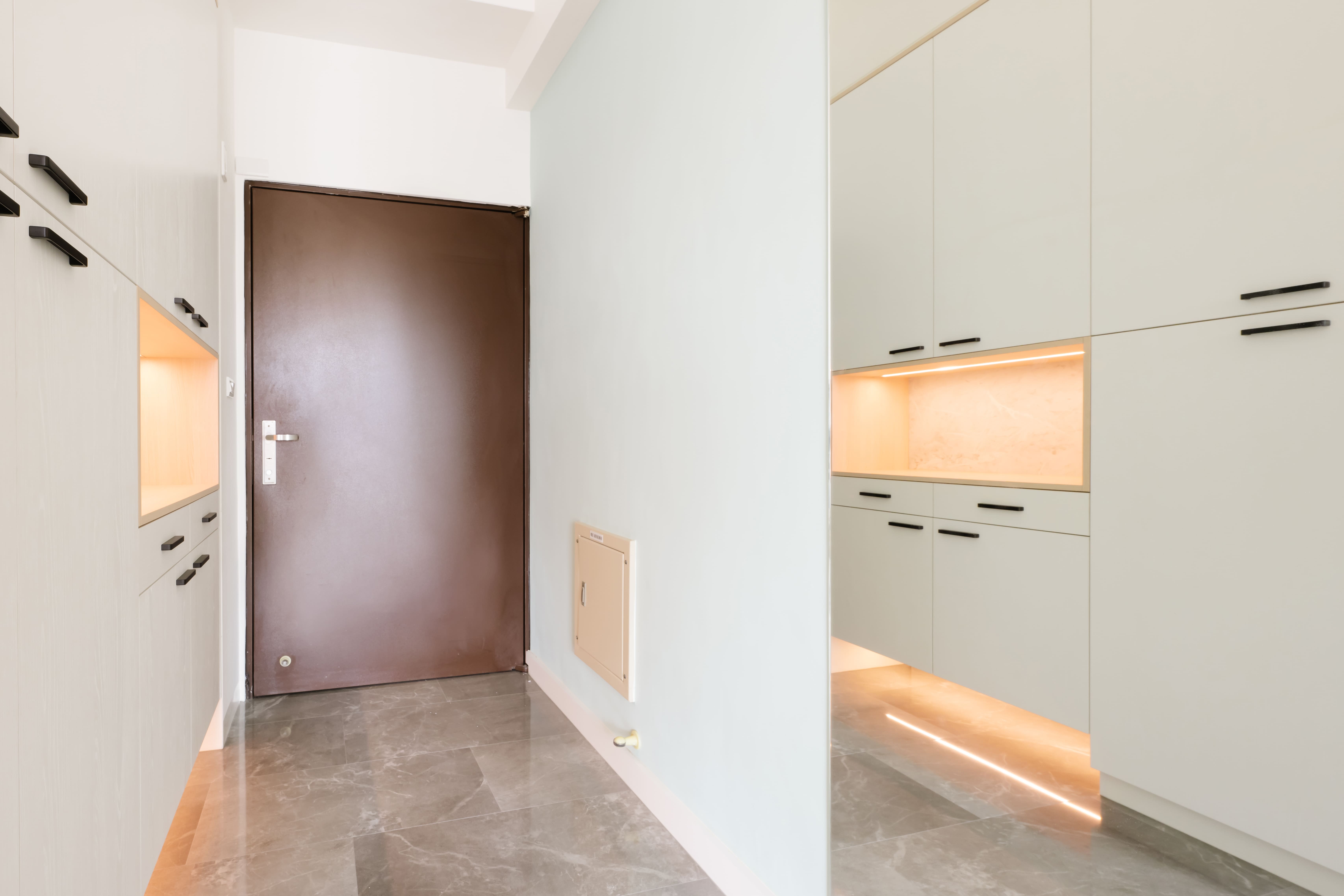 在玄關設計空間中,也規劃出了落塵區,並以仿大理石及木地板區隔不同的材質做為室內外的分界。