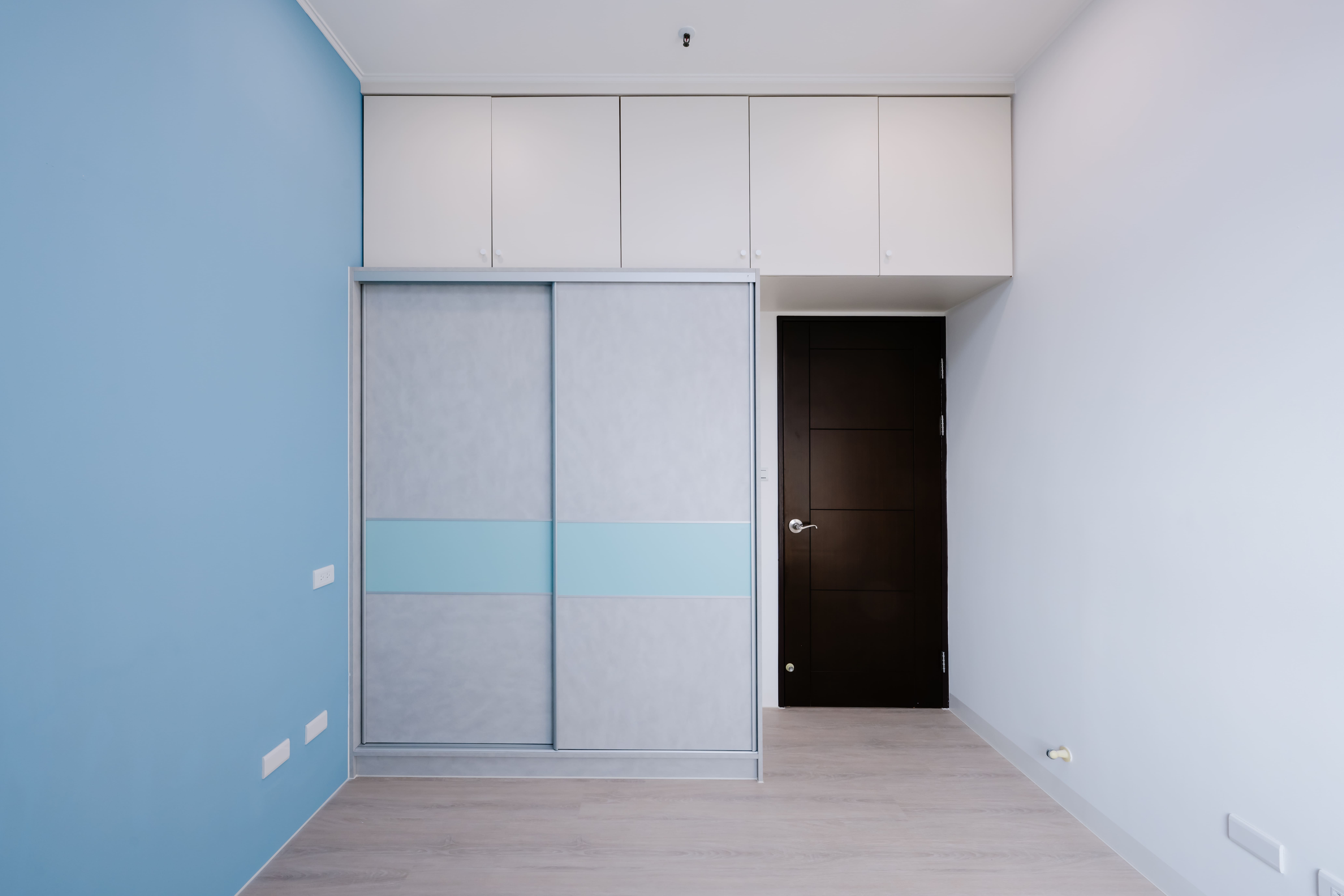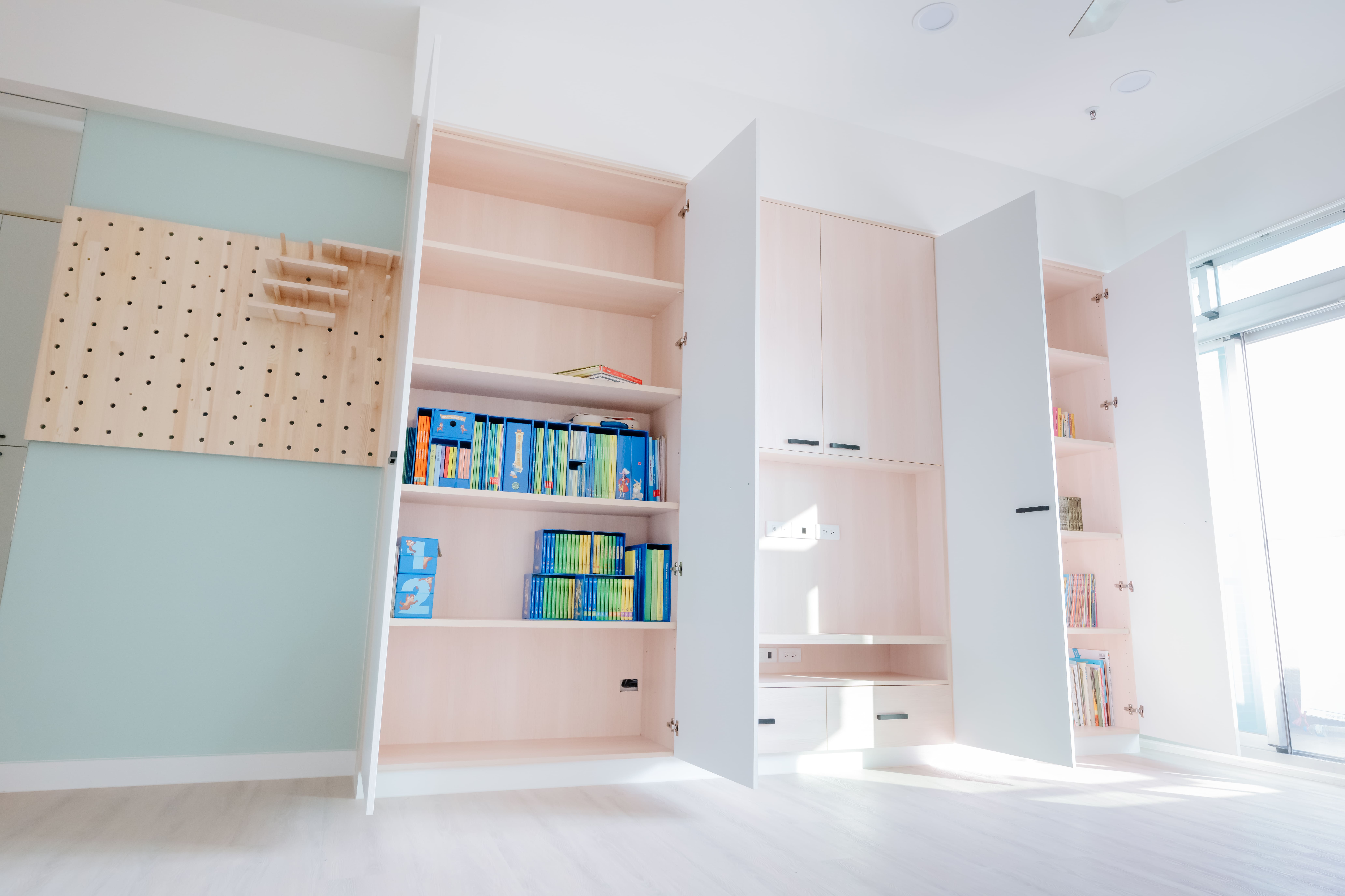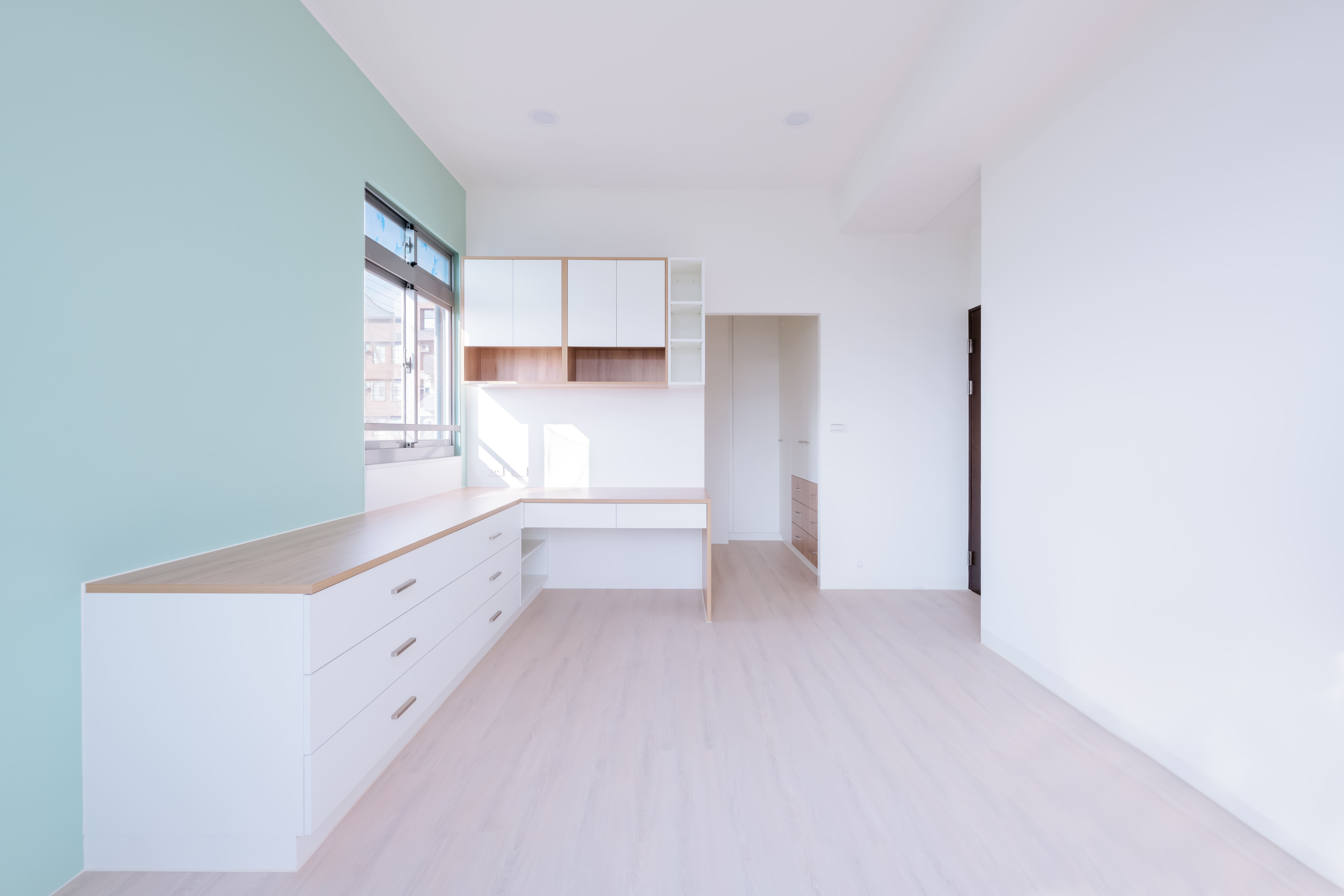 由於部份狀態良好的櫃子未拆除,但因早期的櫃體顏色比較重,也將舊櫃子重新噴上色,並與新做的系統櫃色系融為一體,避免了深色沉重的感受。