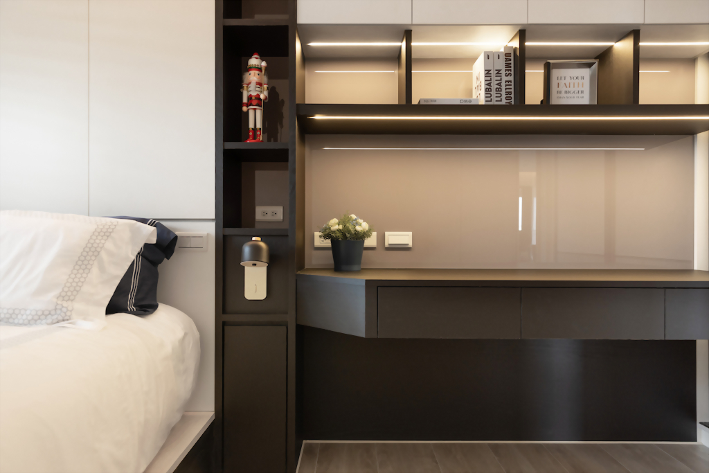 在床側也貼心搭配矮櫃、方便居住者及就寢時可順擺放私人小物。
