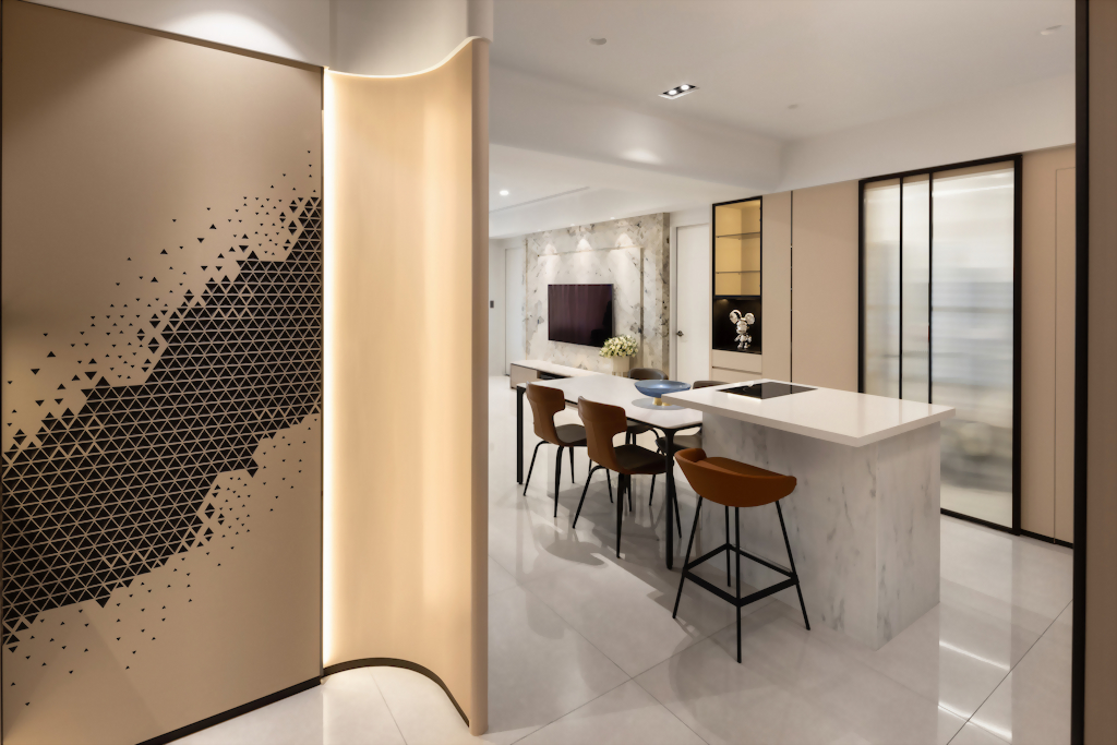 在入門處,以淺色並帶點設計紋路的玄關隔屏,巧妙的擋住了一眼看穿室內的尷尬。