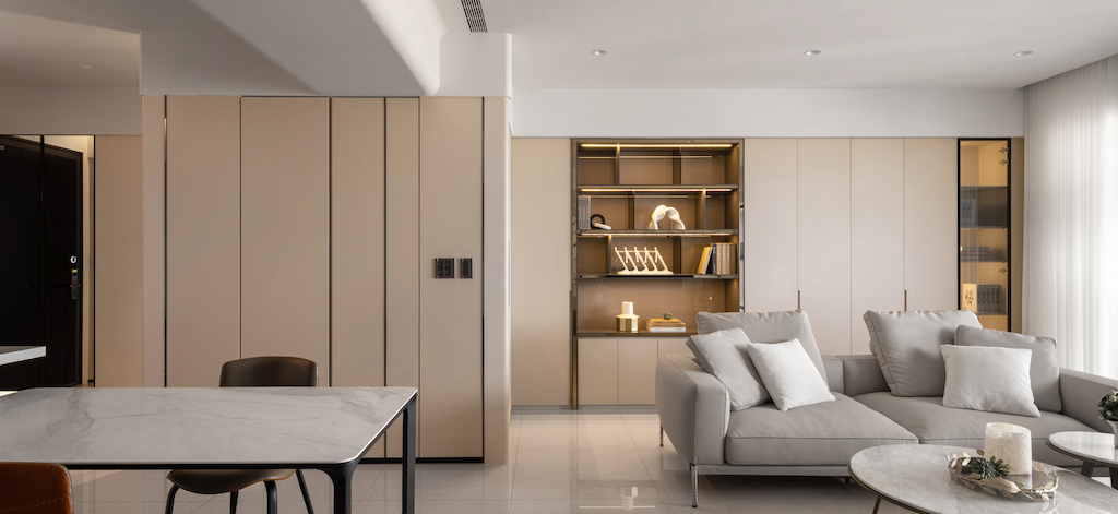總體利用開放式收納櫃相互穿插,可以適時的陳列屋主展品也能讓公區不顯凌亂。