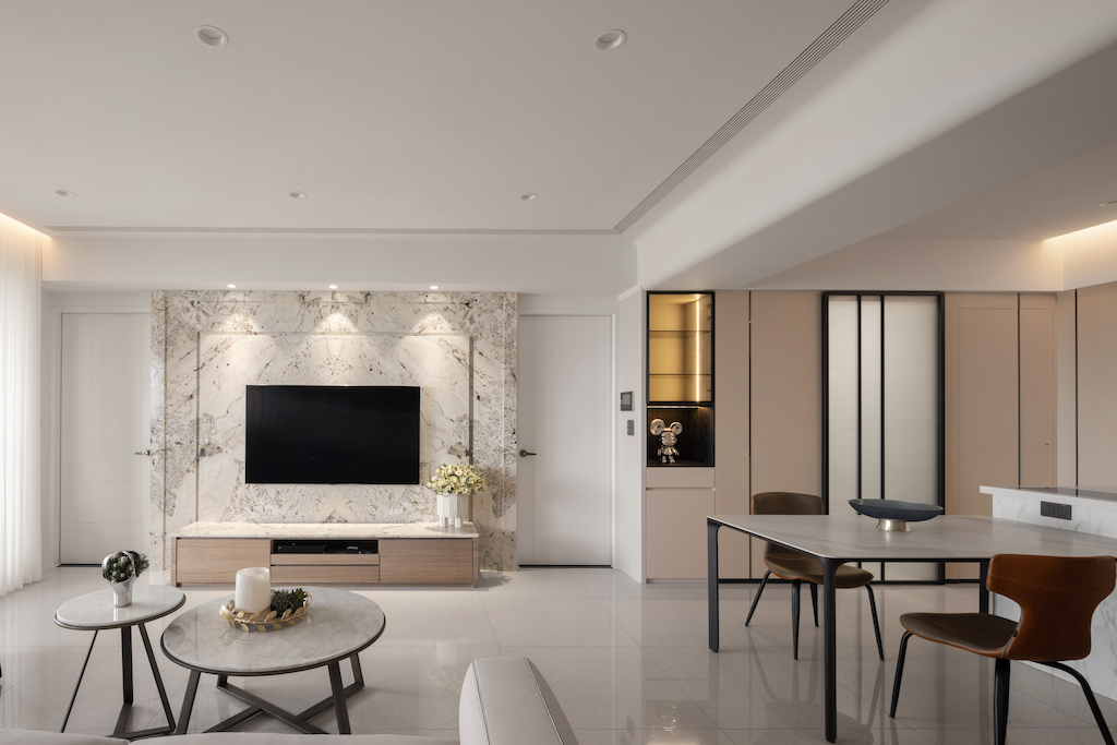 特別值得一提的是客廳電視牆,總體以系統櫃加石材為主呈現,輔以奢華感的鈦金屬線條。