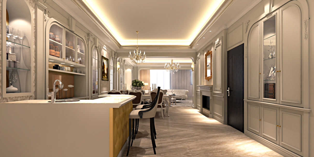 包含餐廳櫃體、吊(壁)燈、經典圓拱門等軟硬體,都加入了古典系的立體線條等。