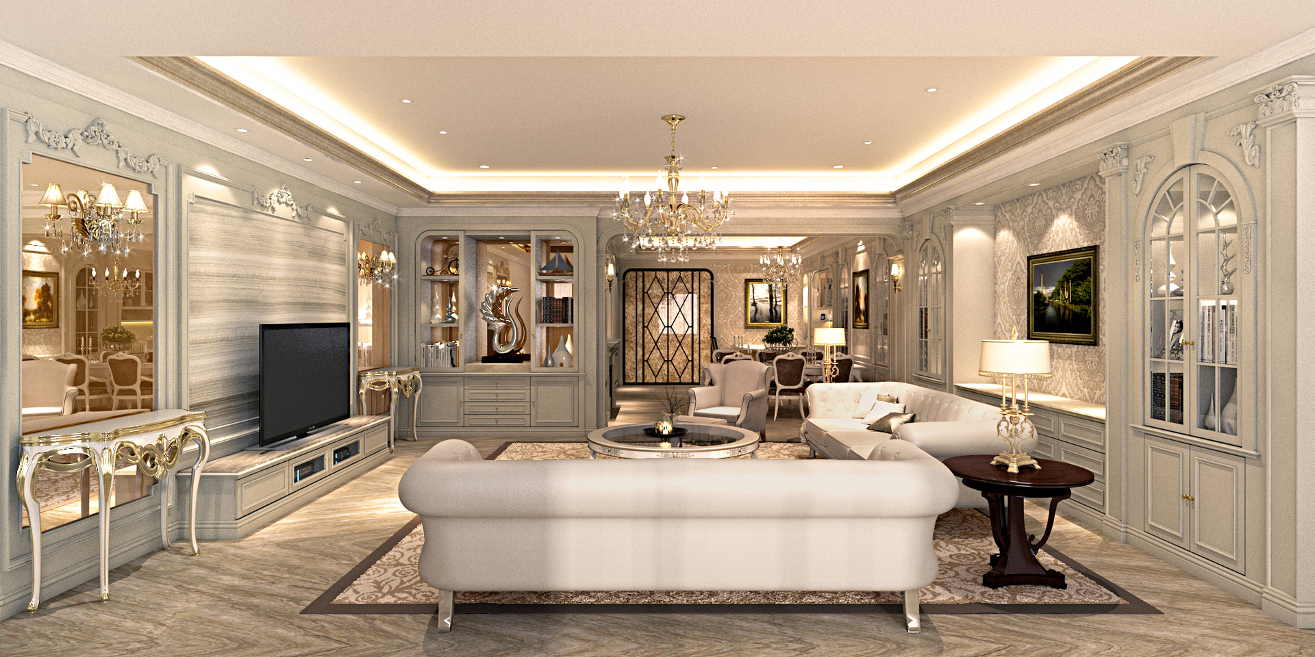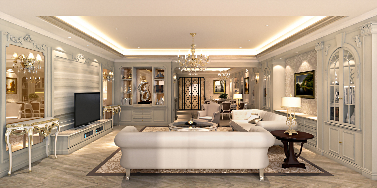 進入到客廳後,可見每一個櫃體、沙發及相關軟件佈置,個個離不開法系美學。