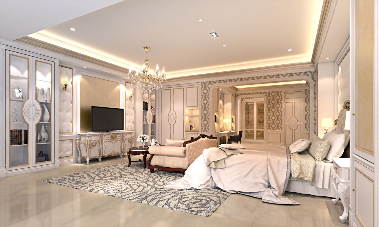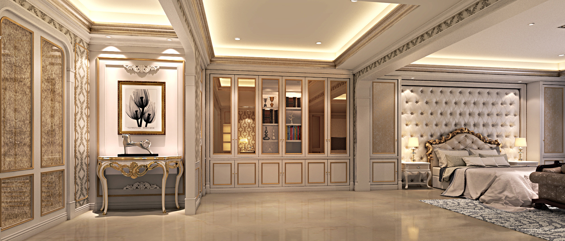 在臥室設計部份,主要可以分為三個區塊:包括有門廳、睡床以及女主人專用的更衣間設計。
