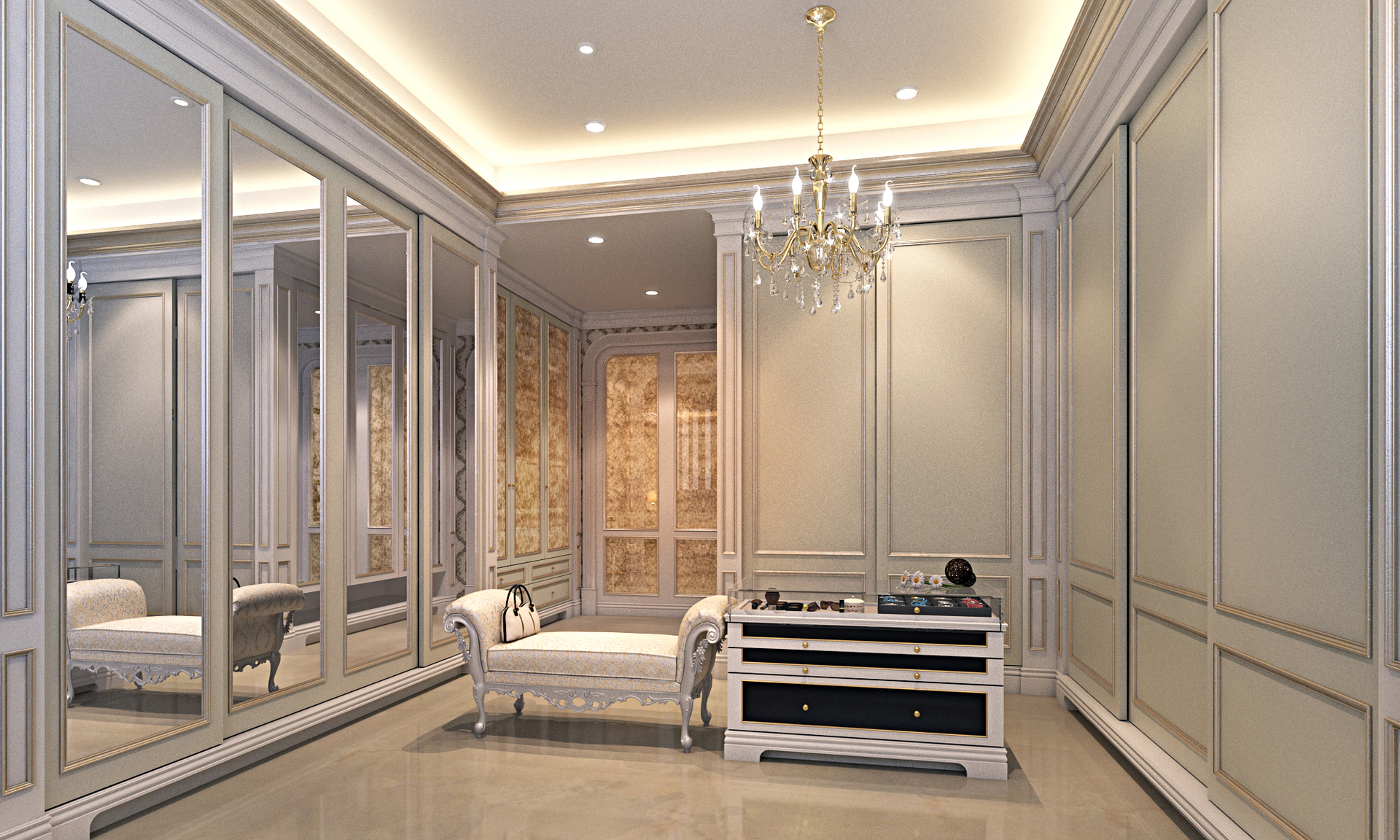 在臥室的最內側,是屋主的更衣間,設計上以大量金屬及白色線條勾邊相互搭配,其古典立體雕花也是亮點之一。