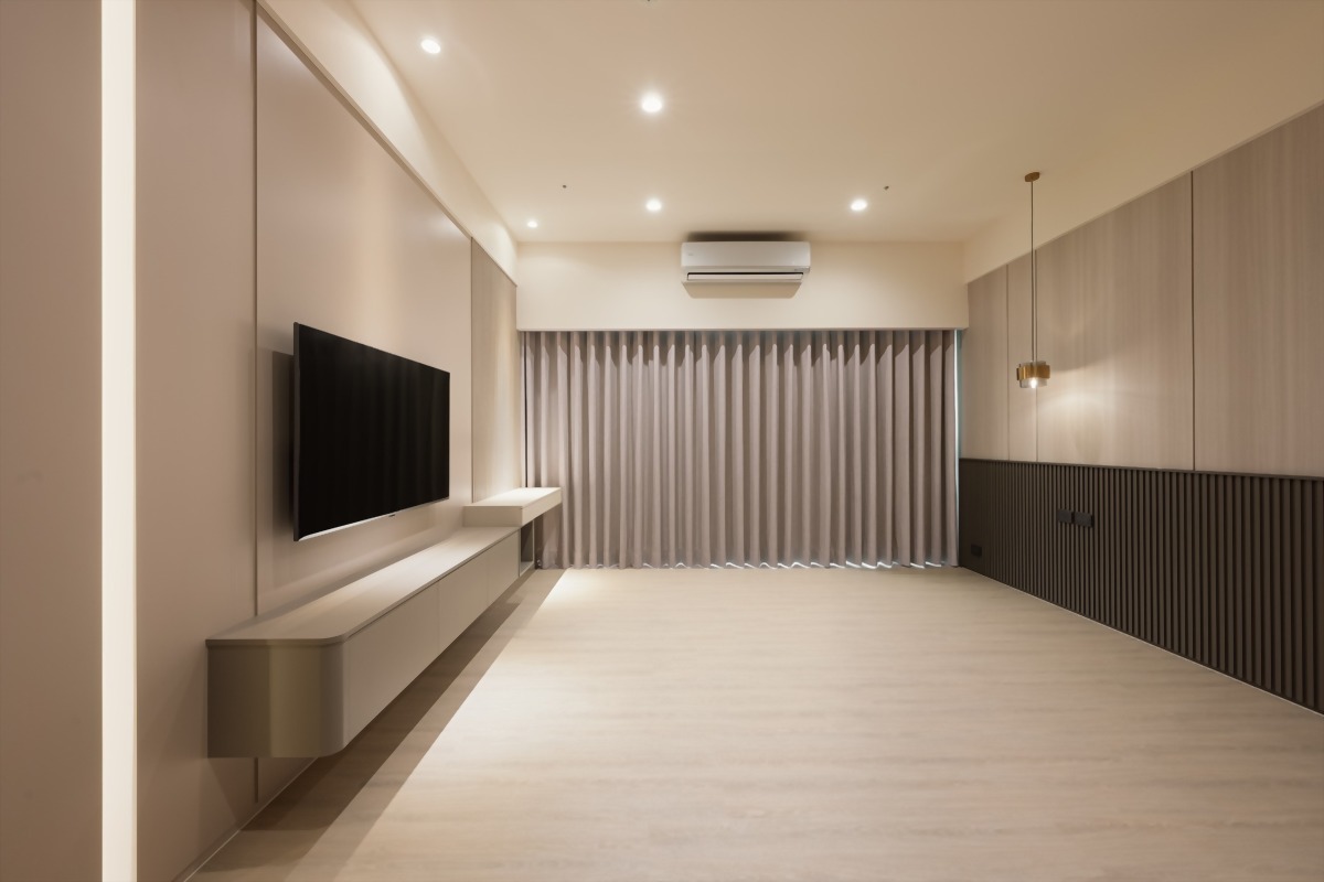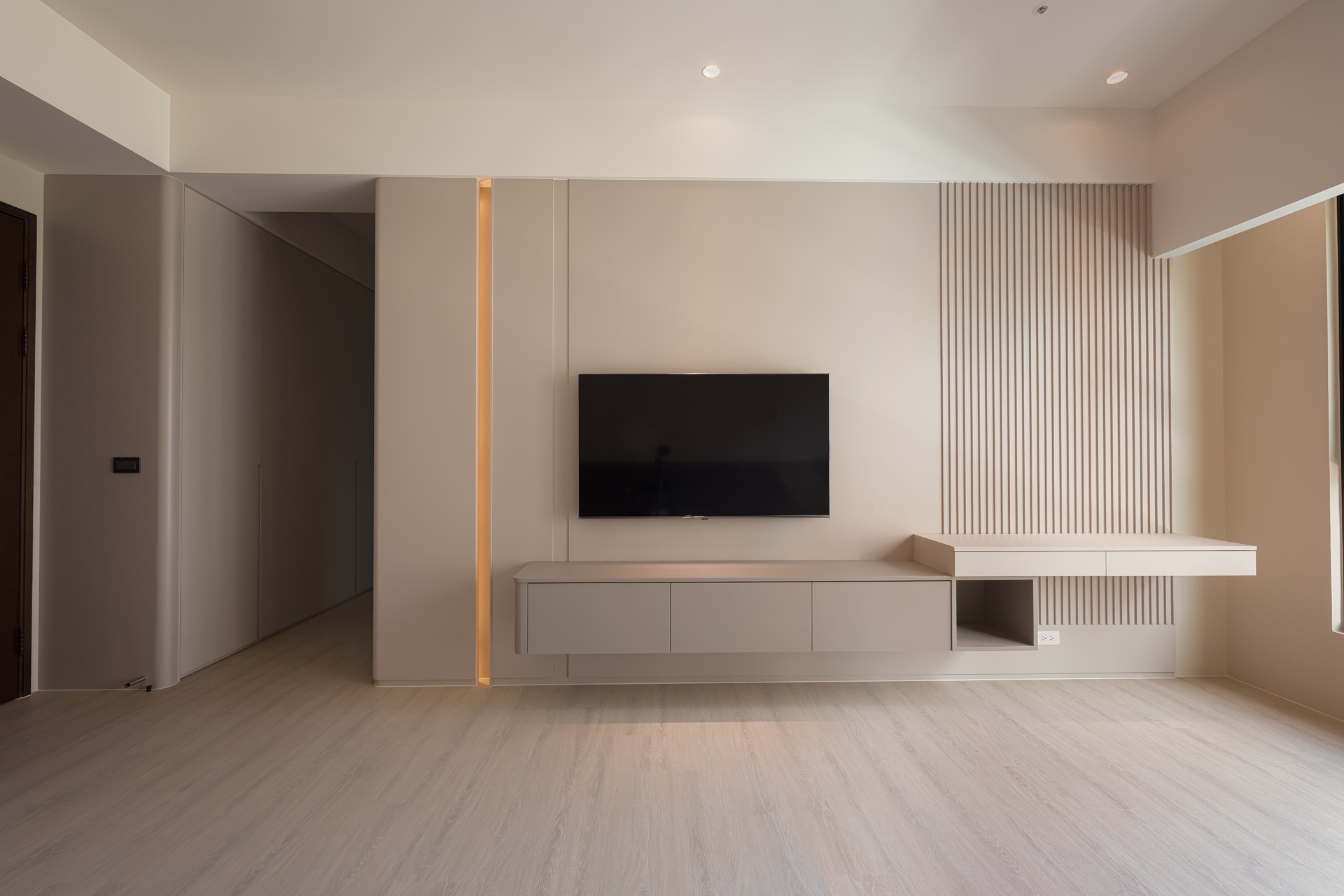為了呼應整體美感,也在電視牆特別設計了隱藏式凹洞,方便電器、搖控等收藏,不讓空間凌亂也不容易丟失。