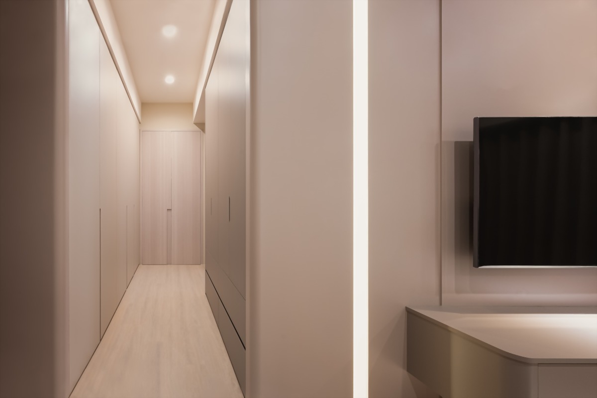 隔屏部份都是使用了淺粉色的木紋為主調,櫃體使用了上、下櫃延伸,讓櫃體加上收納物品後仍保有空間輕盈的感受,無壓迫感。