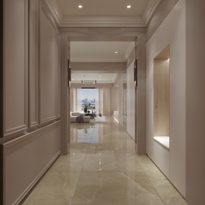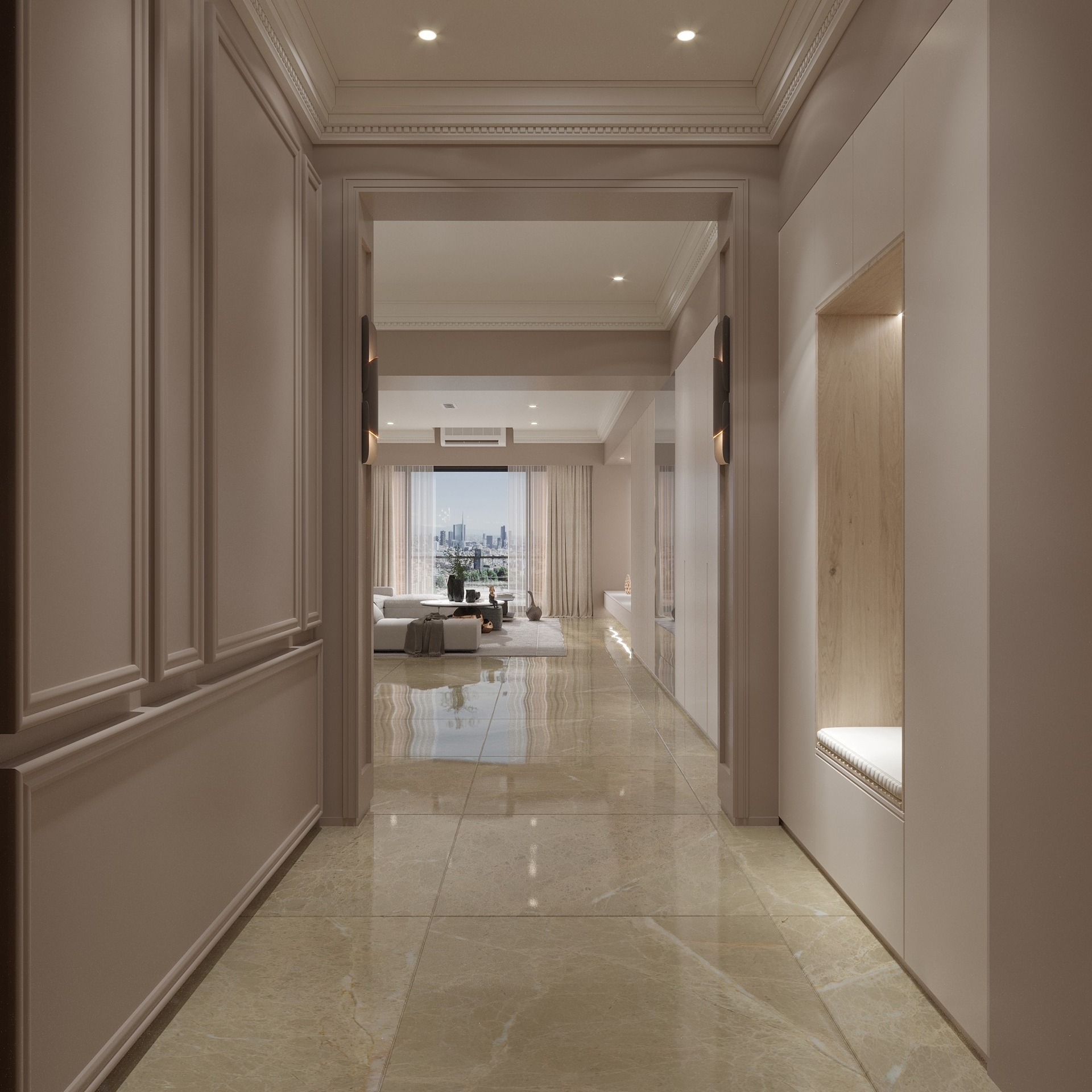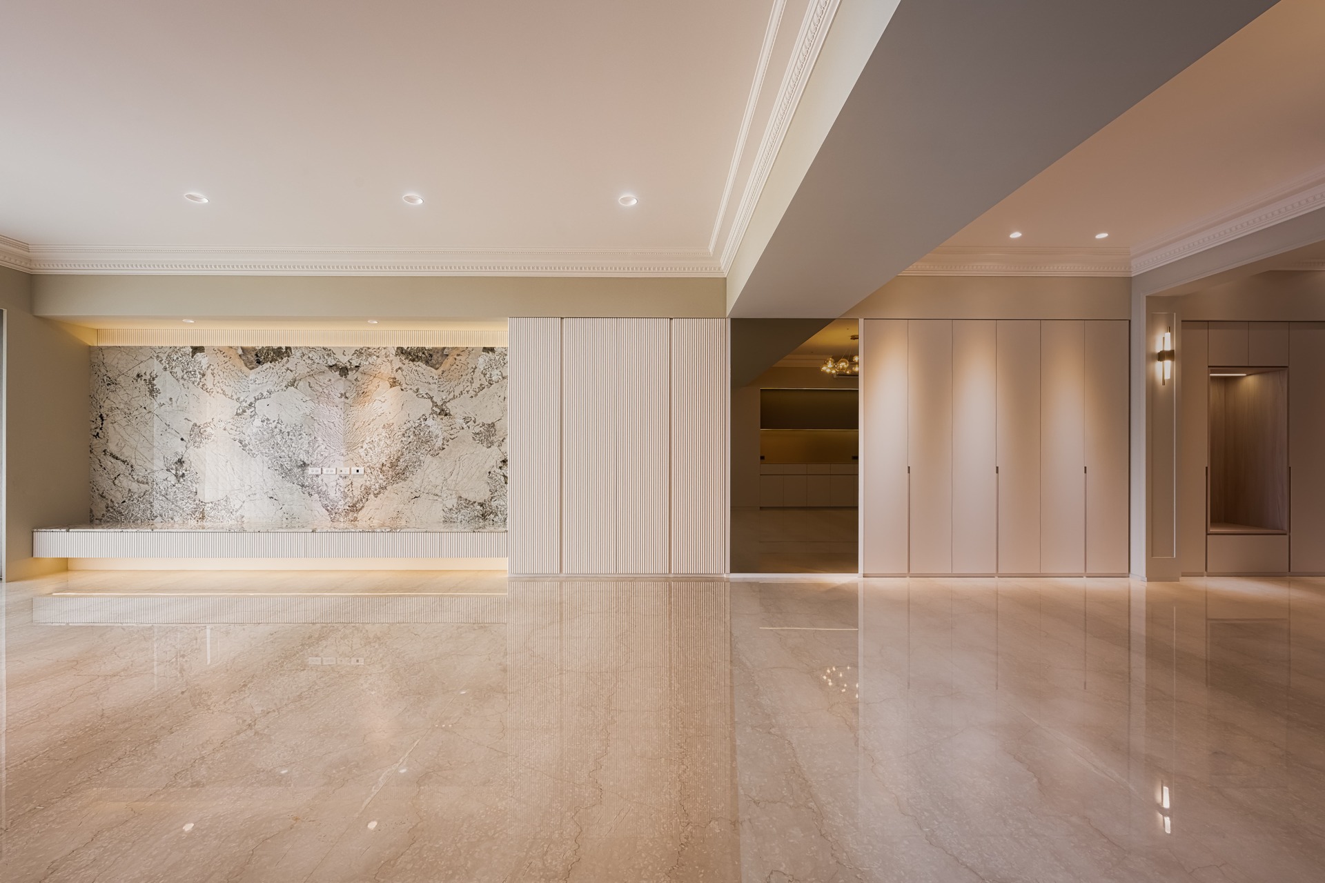 從進入玄關開始,就可以感受到古典輕奢風格的浪漫與優雅;線板、素雅奶茶色,以及利用拱門做為玄關門廳的分界…… 為了讓風格到位,許多玄關細節也不可忽略,包括壁燈的搭配,鞋櫃、穿鞋椅的佈置。