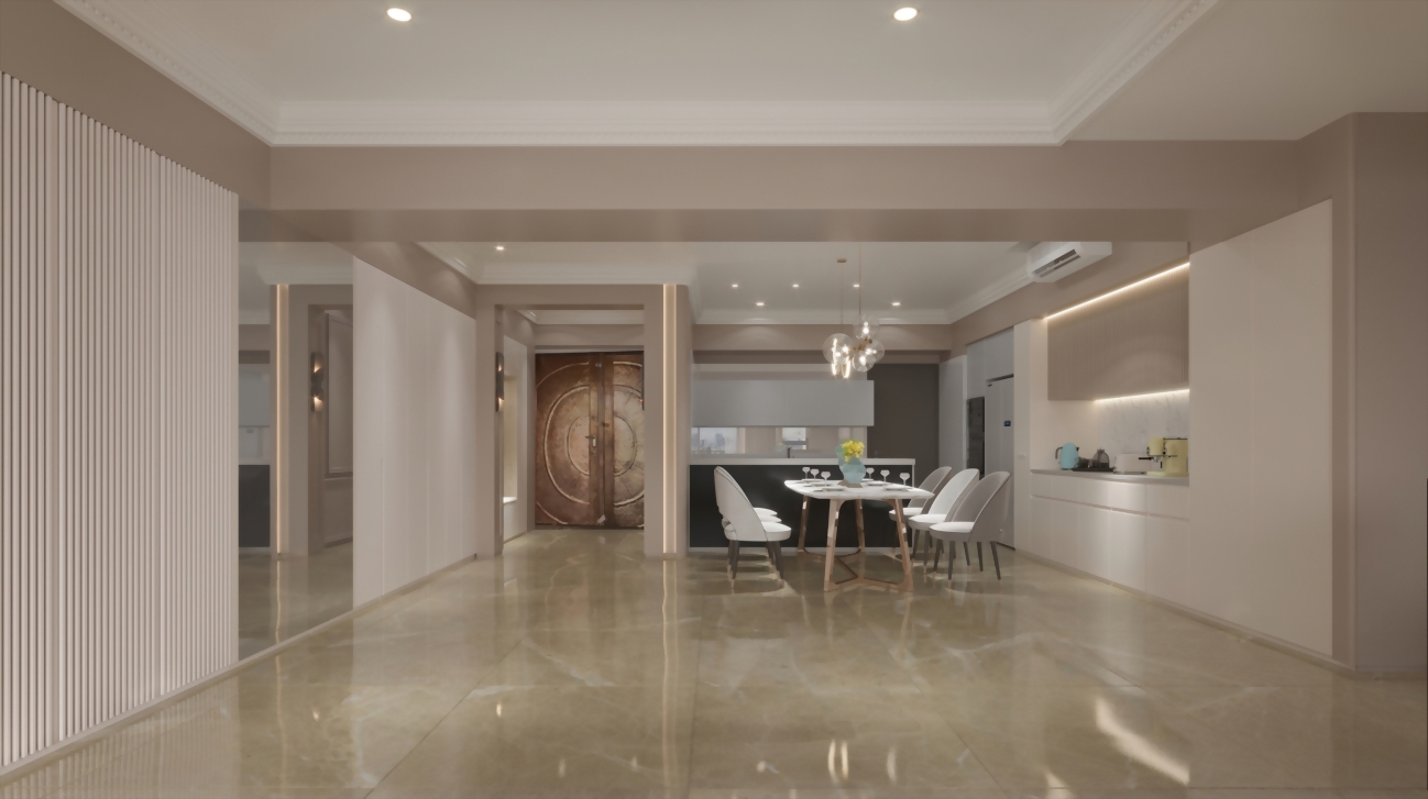 將廚房、餐廳、收納、備餐的動線及空間設計一併考量後,在餐廳仍然保有三五好友、家人的共享空間,寬敞舒適,最適合好友相聚,放鬆交談沒有束縛。
