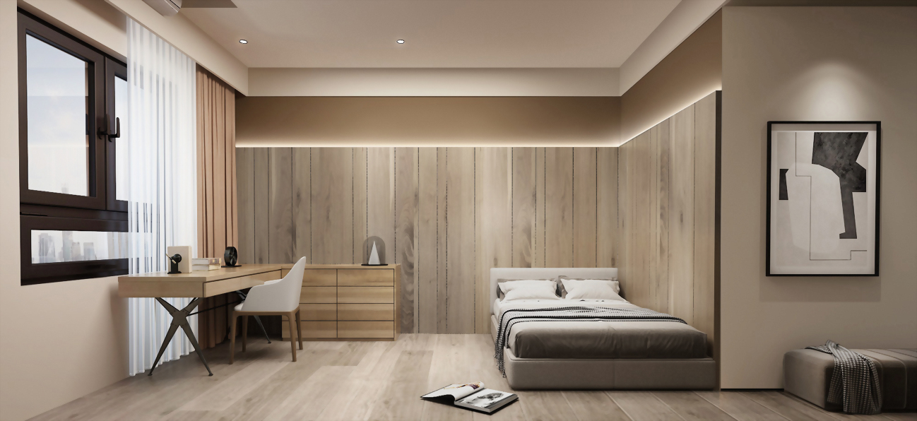 孩臥部份,則是以木紋壁板加上溫暖的燈光設計。