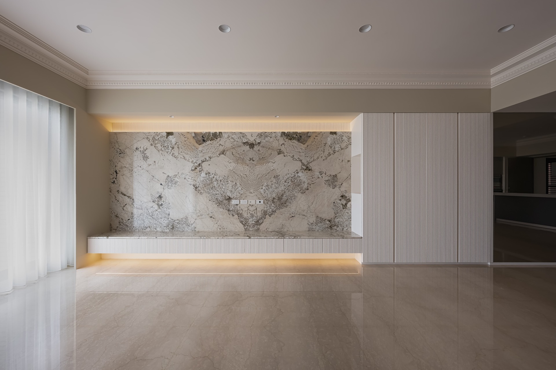 在電視牆的材質方面,特地為屋主選用了「奢石-天使之心」。