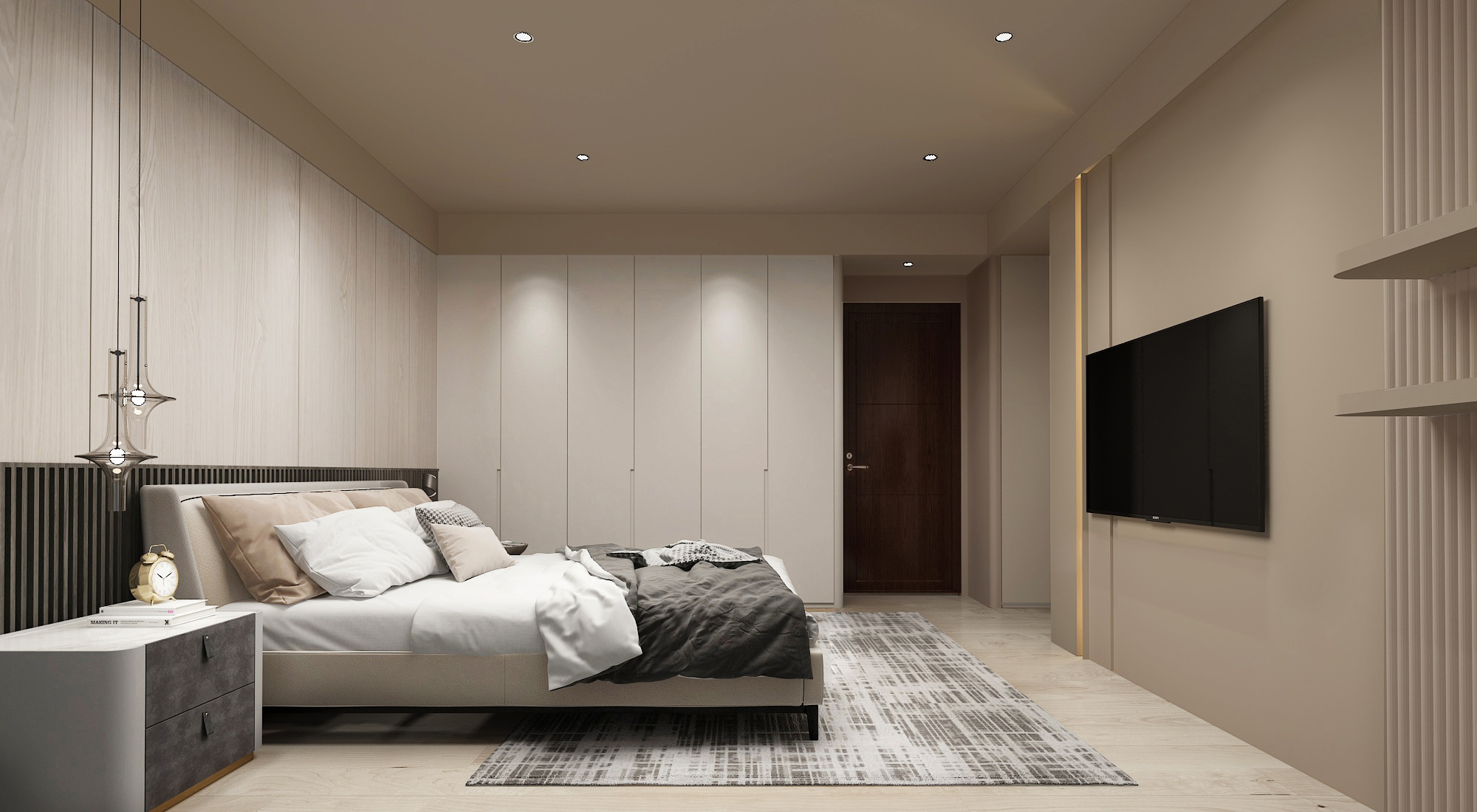 主臥室設計以米色加上奶茶色為主調,地板也使用了淺米灰色系的超耐磨木地板。