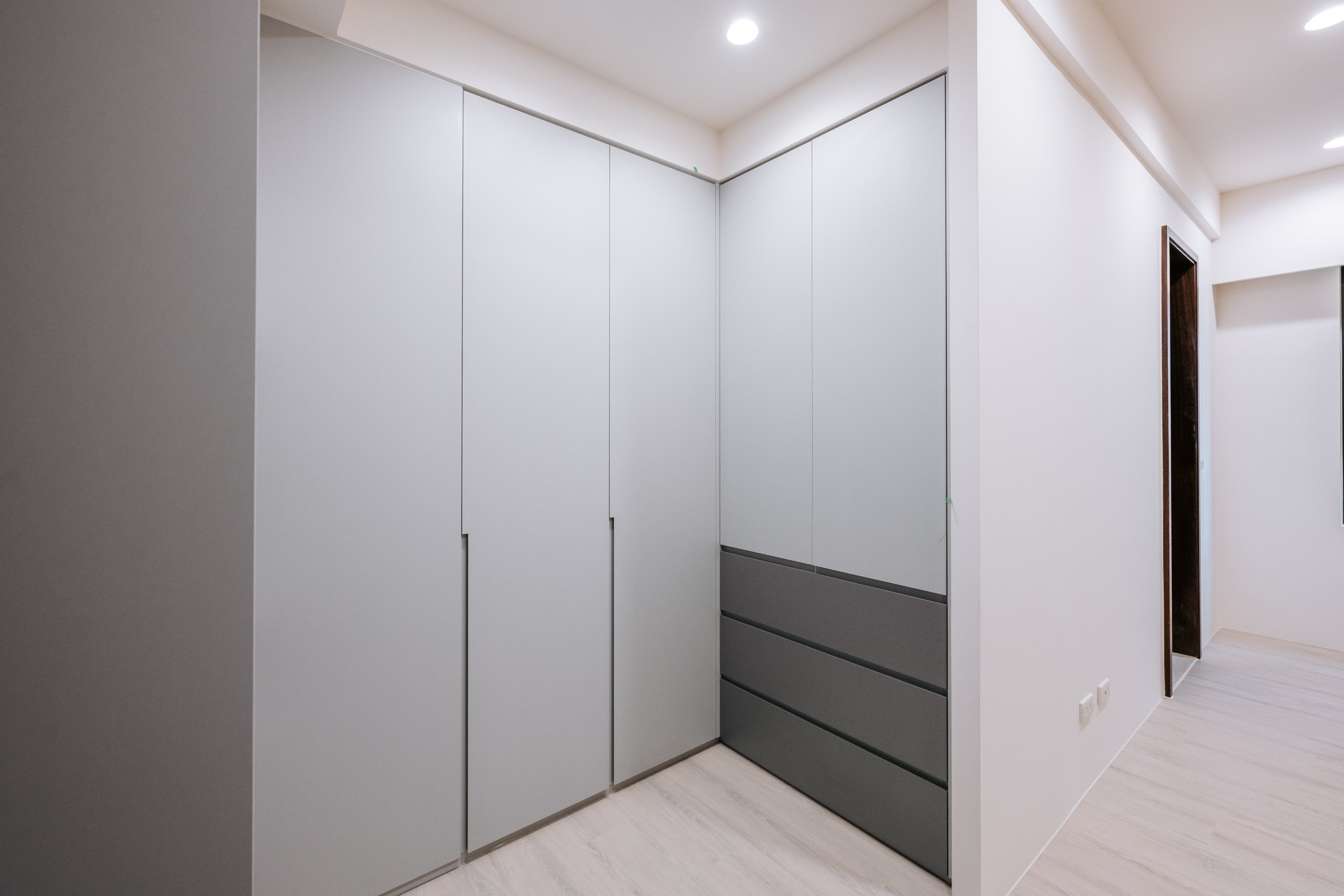 整體收納採用了系統衣櫃,圍出來的更衣區使房間機能更完整。
