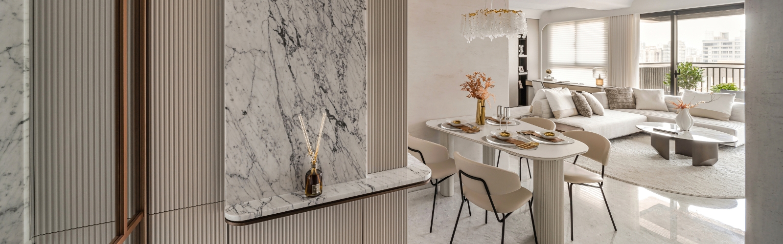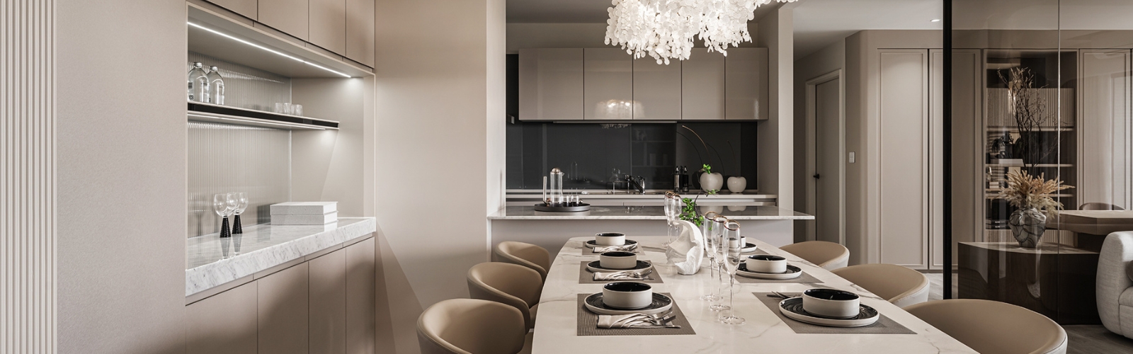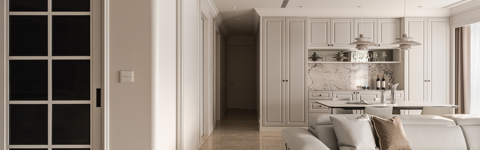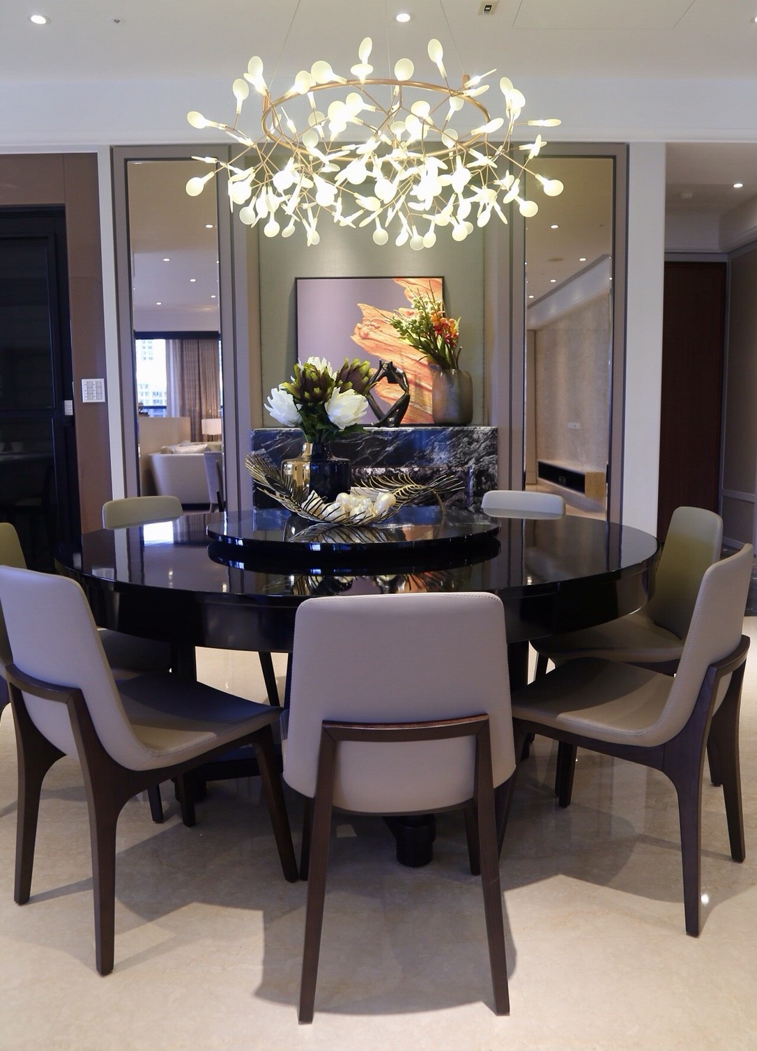 以現代簡約風格為主的美術愛河,在開放的迎賓空間中,有一處重要的環節,那就是餐廳。團聚的時候,美食,燈光、餐桌,是氛圍營造的重要功臣;餐桌上方的燈具,以獨特設計的造型,融合了整體空間呈現的古典風格之美,也照耀出家的溫馨感。