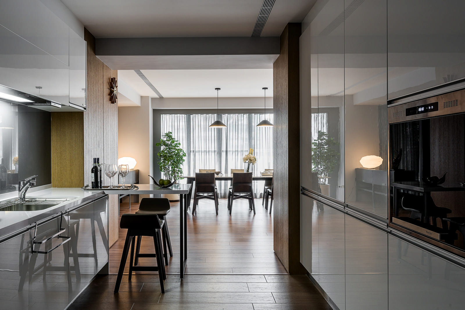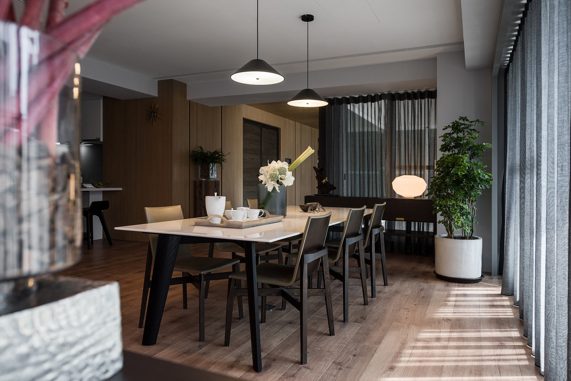 以長型毛胚屋格局創造最佳的生活動線,是白玉岸最迷人的地方。整體開放式的公共空間,包含了客廳、餐廳兩個主要讓家人談心、交誼的所在。在客廳沙發隱形分界後方的餐廳設計,以木製的長桌(椅)為主角,搭配素色的吊燈。不同於一般餐廳,為了收納機能大多還會有吊櫃、備餐櫃等不同設計穿插,就喜歡以「簡單」為主的屋主,讓餐桌看起來就是很純粹「好好用餐」的地方;另一好處則是,沒有過多的開放式櫃體收納,能讓開放式迎賓空間看來空曠、整齊。
