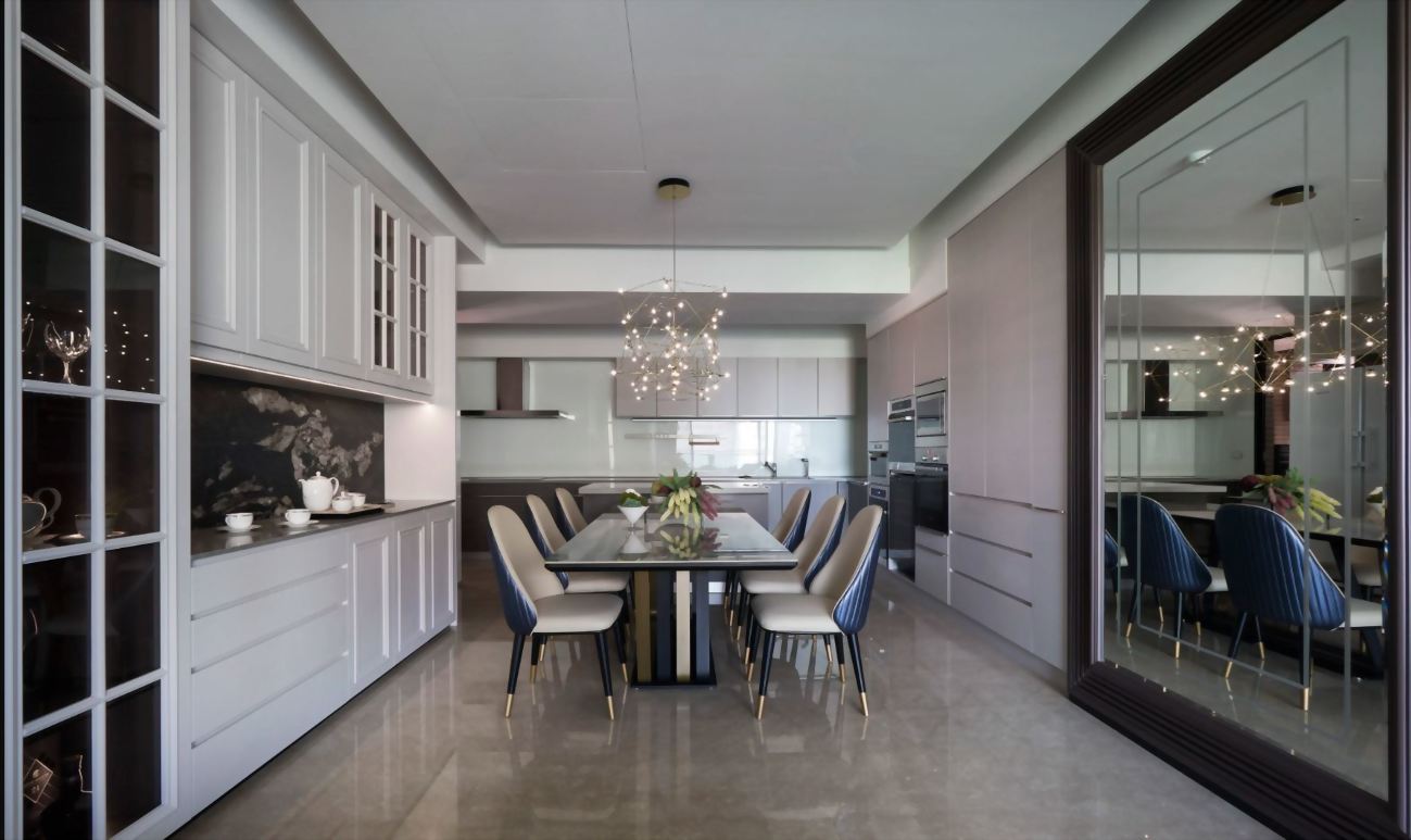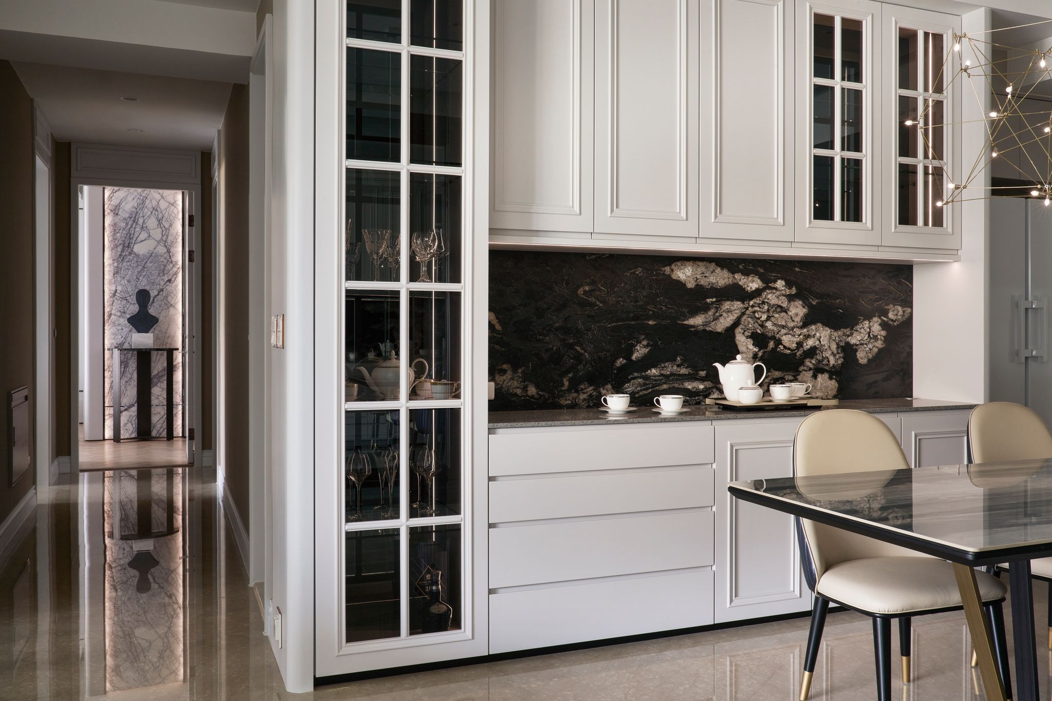 延續客廳設計空間古典的設計,餐廳設計讓人有一種置身中世紀歐洲莊園的錯覺,不為別的,就是那優雅簡潔的配色以及線條感,還有木質混搭的小清新感。平日裡家人、好友各自忙碌,好不容易難得比肩而坐的好好用餐,儀式感及尊寵自是少不了。將收納機能從餐廳設計開始,放置各種機能合而為一的收納櫃。包含備餐空間、可視玻璃的展示空間,還有收納的門片及抽屜式設計……這些都是讓餐廳廚房優雅不凌亂的秘訣。