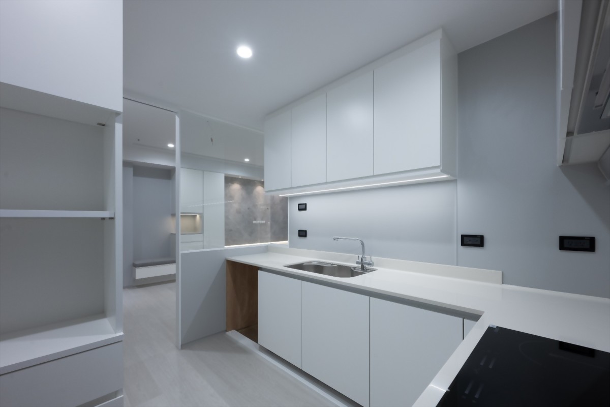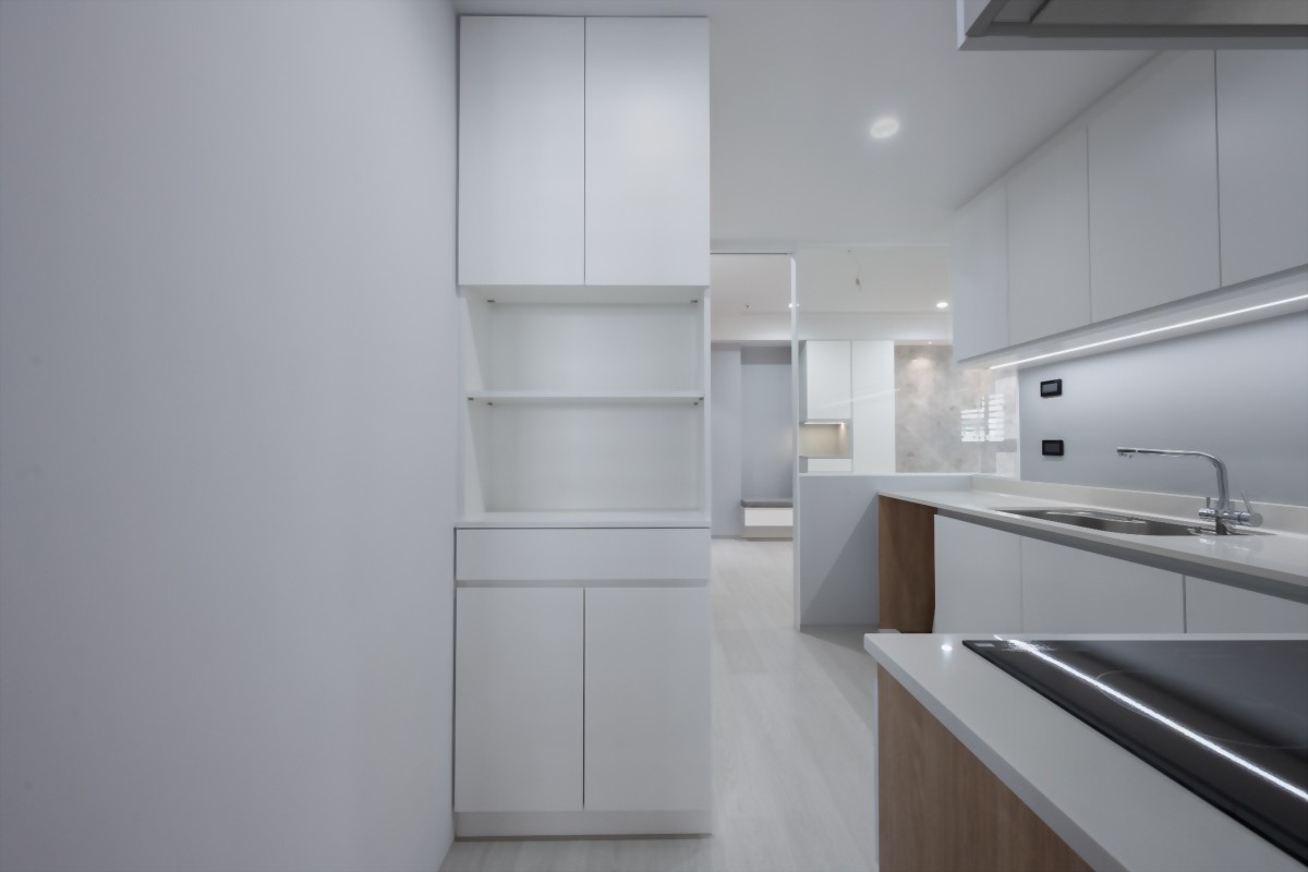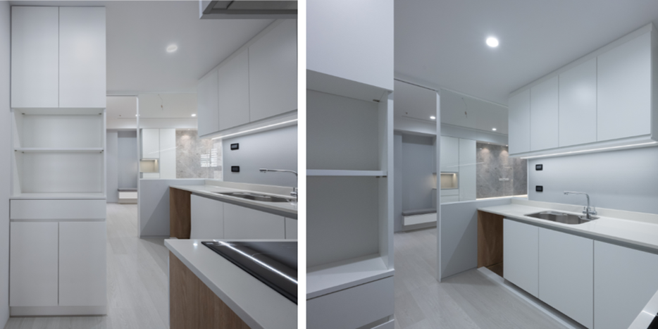廚房設計為了讓收納機能更強,也特別為屋主設計了吊櫃、淺櫃等各式機能不同的櫃子。無論是大大小小的調味瓶罐,餐具甚至是電器,都能找到好使用的位置。