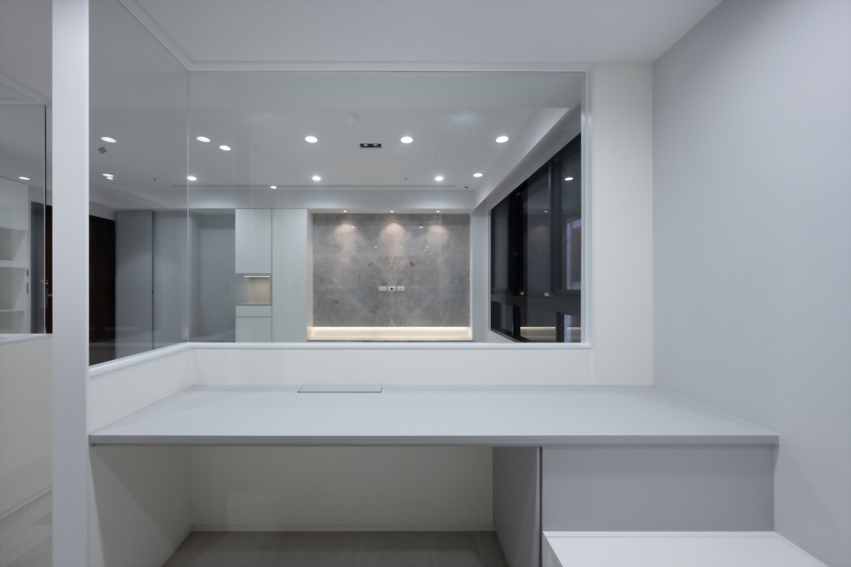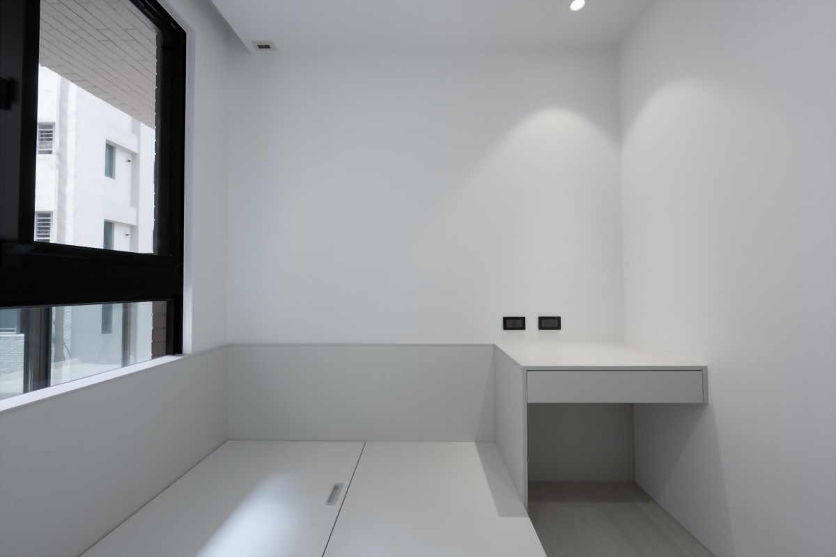 書房設計和廚房一樣採用了半面玻璃隔開設計為半獨立區域,配置了書桌、臥榻、收納書架等基本但又更強力的設備。由於屋主本身為科技新貴,最重視書房是否能提供絕對的高效工作,故在書桌的下方部份也設計線槽盒能使其完整收納。