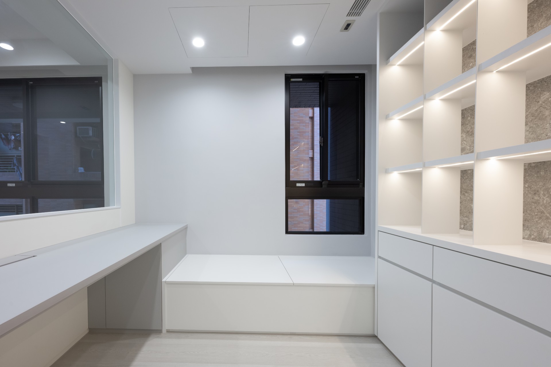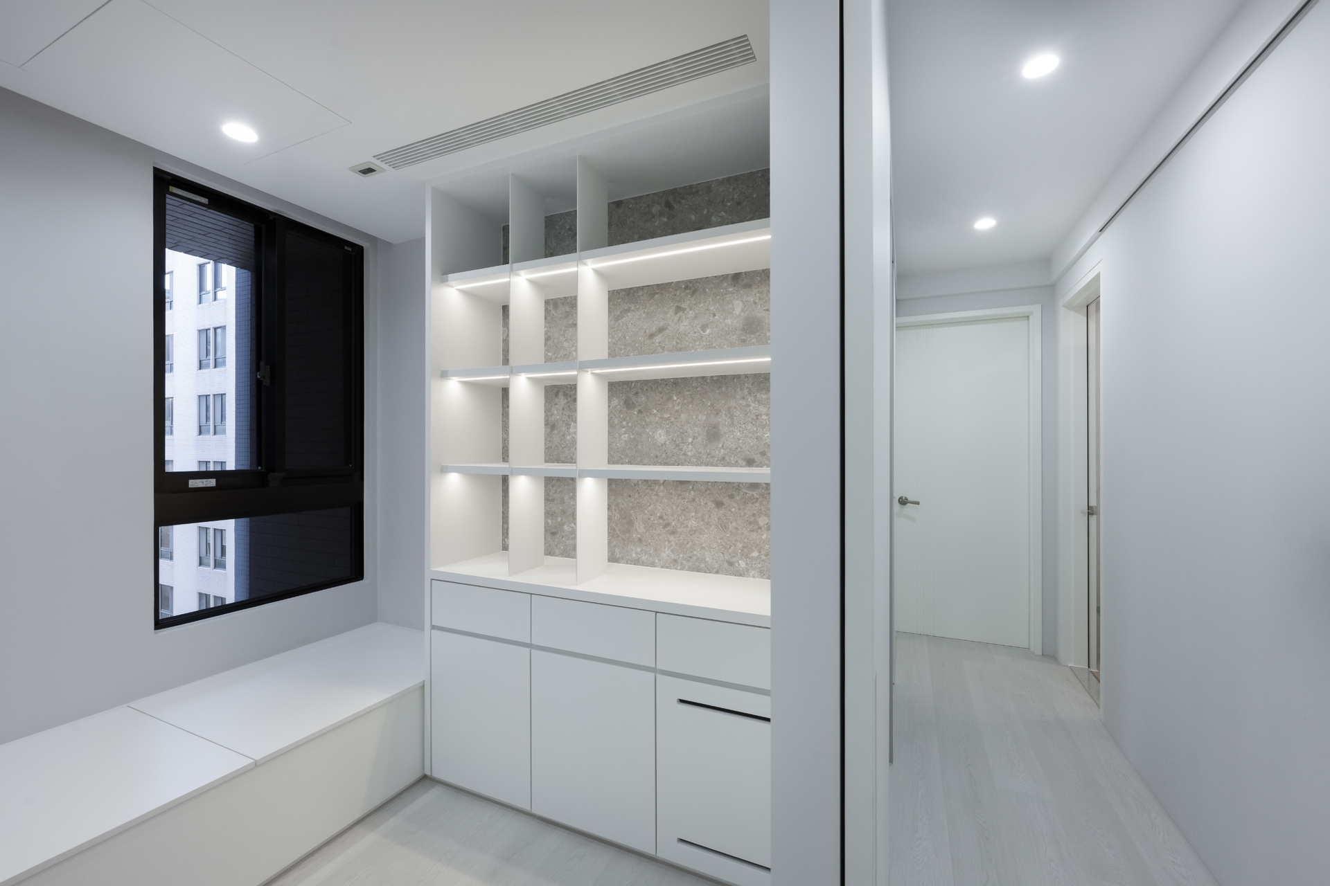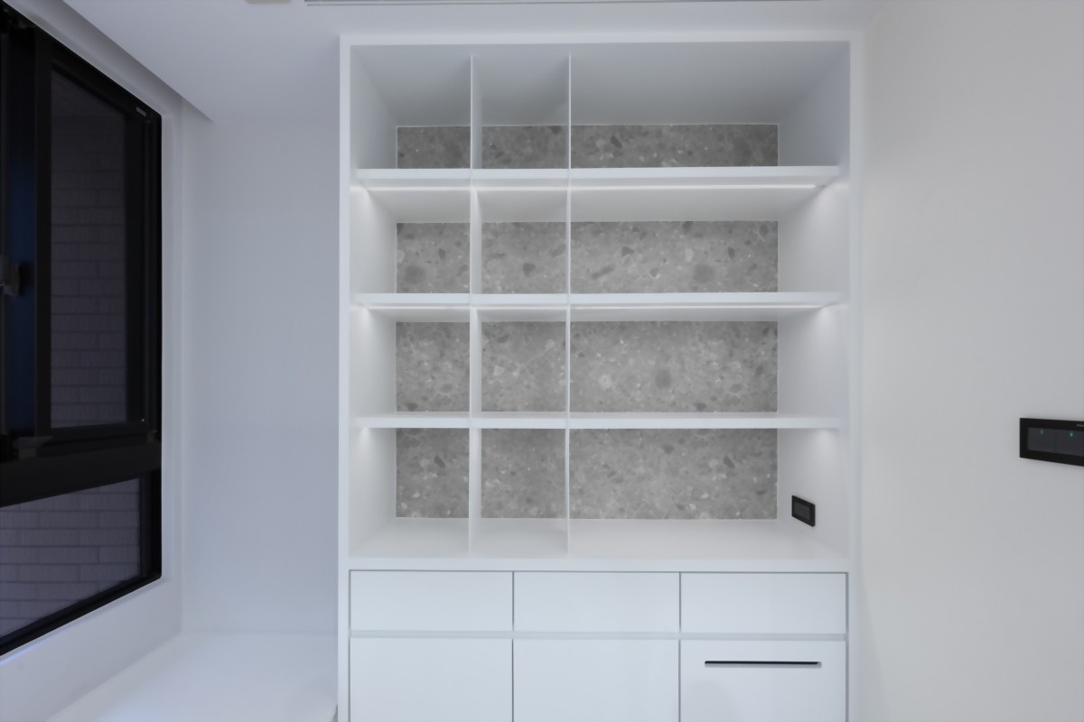 完整的收納空間,可讓屋主多方面運用;延續簡約配色與書櫃的仿石板運用,給予書房工作空間:乾淨、高效、井然有序的感受。