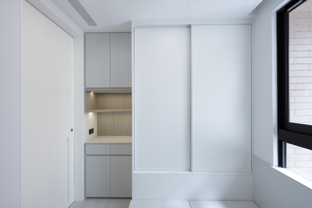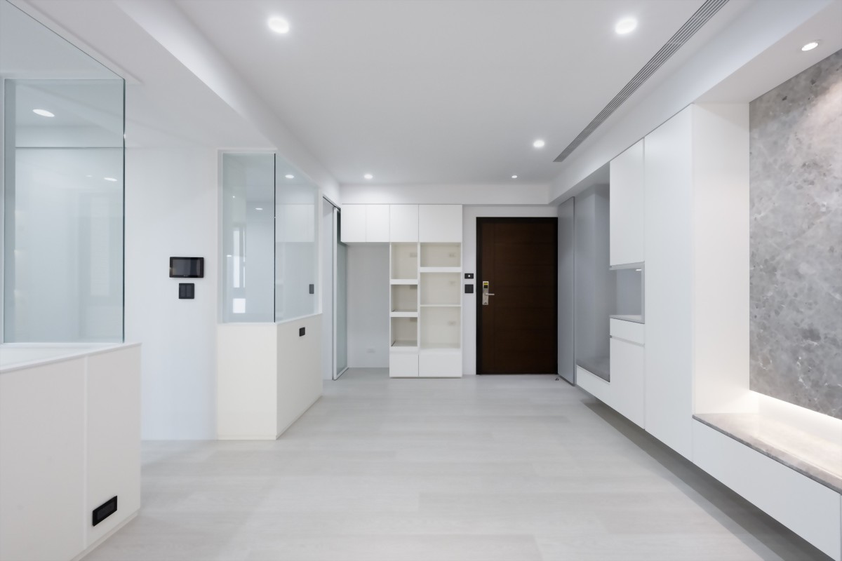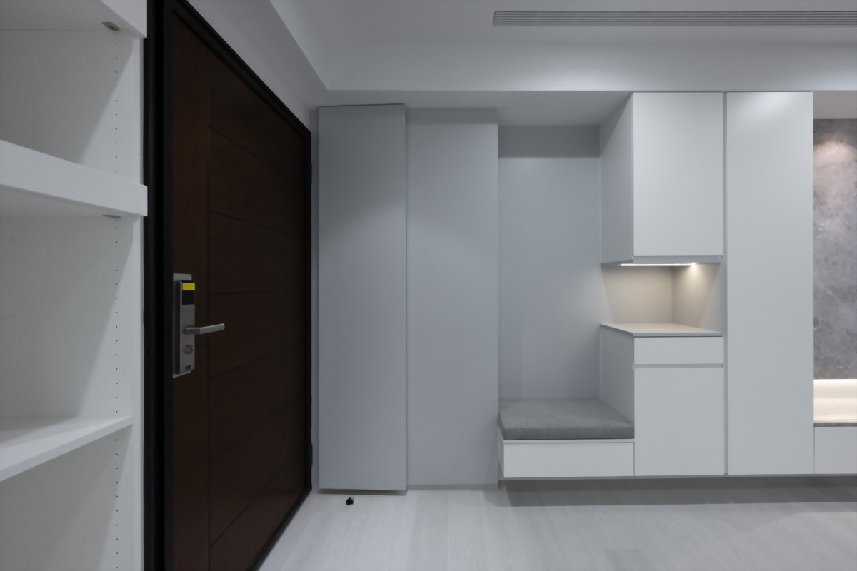 由於小坪數空間有限,為了不再讓空間因為過度切割而顯得零碎及狹小,玄關設計針對人口較少的居住情況,以「簡約」、「實用」為主。