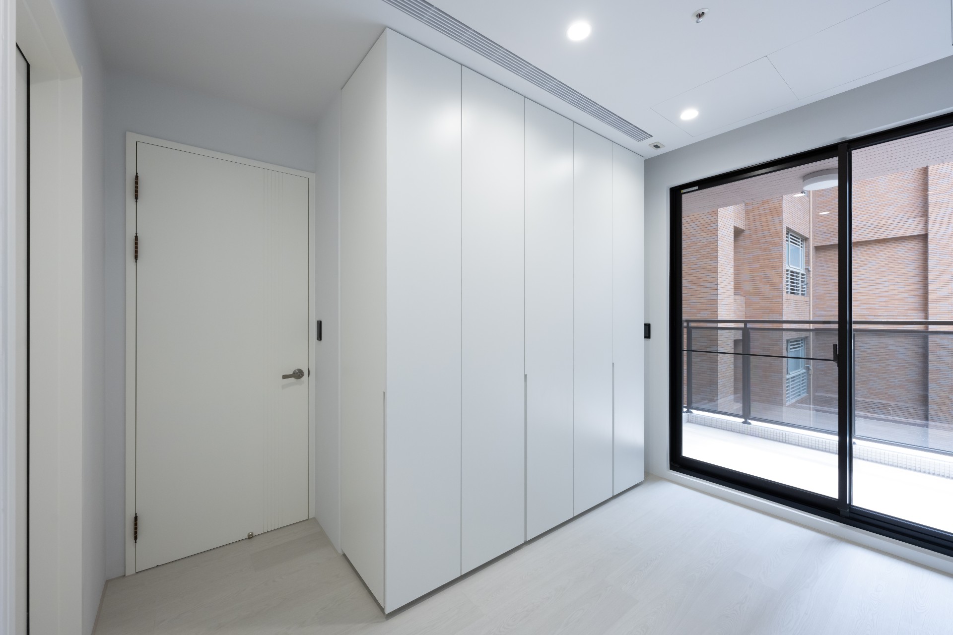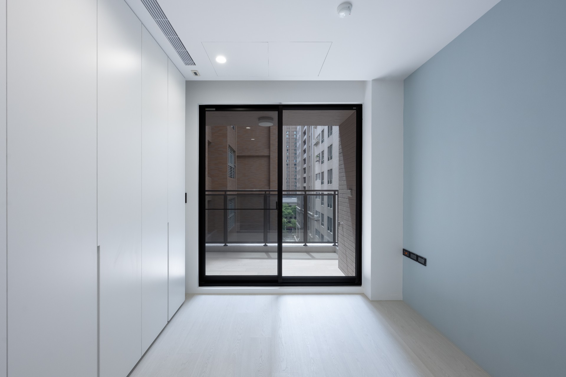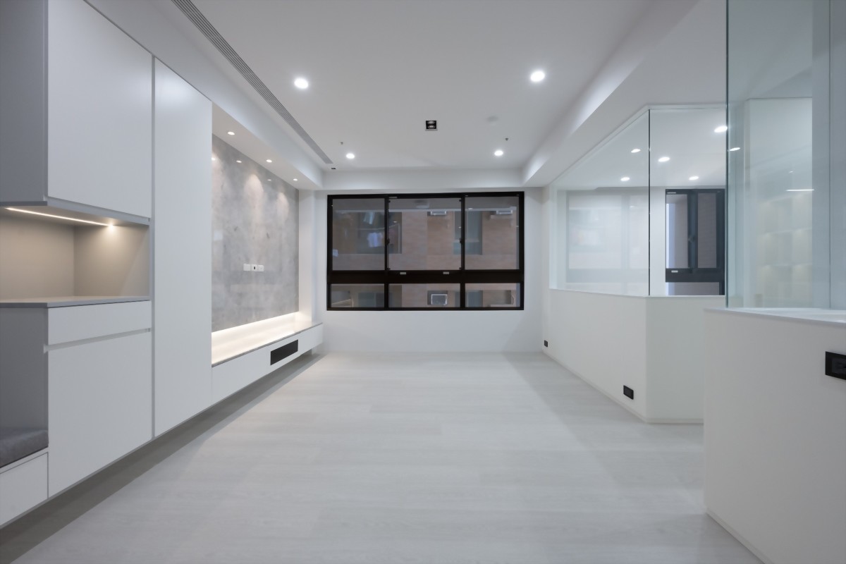 臥室部份同樣延續主設計簡約灰、白的質感,但在臥室的床頭中,為屋主做了一點小小的顏色變化,為其做了和諧的刷色設計。