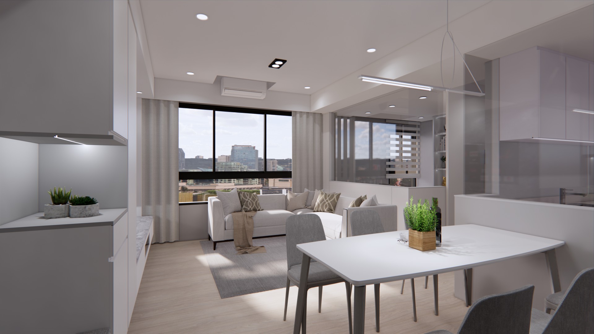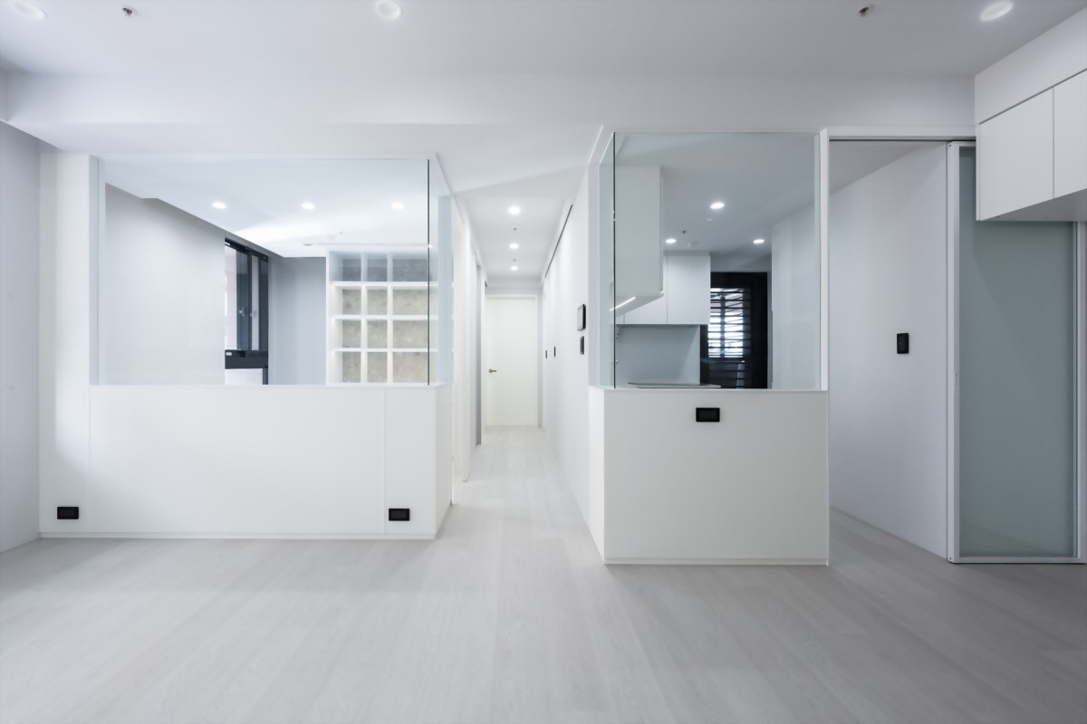 在公領域空間中,包含客廳設計、廚房設計、書房設計,共處於一開放式的空間中。看起來雖然便利,但每個空間仍有其規劃的必要性,像是廚房的部份,因為有油煙及食物味,所以也特地做了透明玻璃的隔間設計。即有通透性不會造成空間生硬切割,又可隔絕油煙。