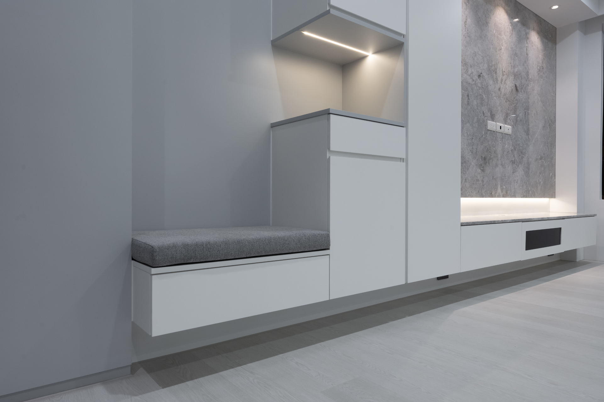與電視櫃合而為一卻又定義為玄關收納使用的系統櫃體,除了讓空間有延伸的寬闊感,懸空的設計讓入門及客廳空間較顯輕盈沒有壓迫。穿鞋椅和椅下收納抽屜,更便利屋主進出穿鞋及整理儀容,常用小物也可以被隱藏收納,讓玄關小空間不顯凌亂。