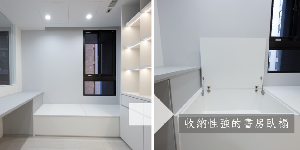 除了在書房中設計自己的休息小天地:臥榻之外,其高度設計為櫃體收納也有相當強的儲物功能。