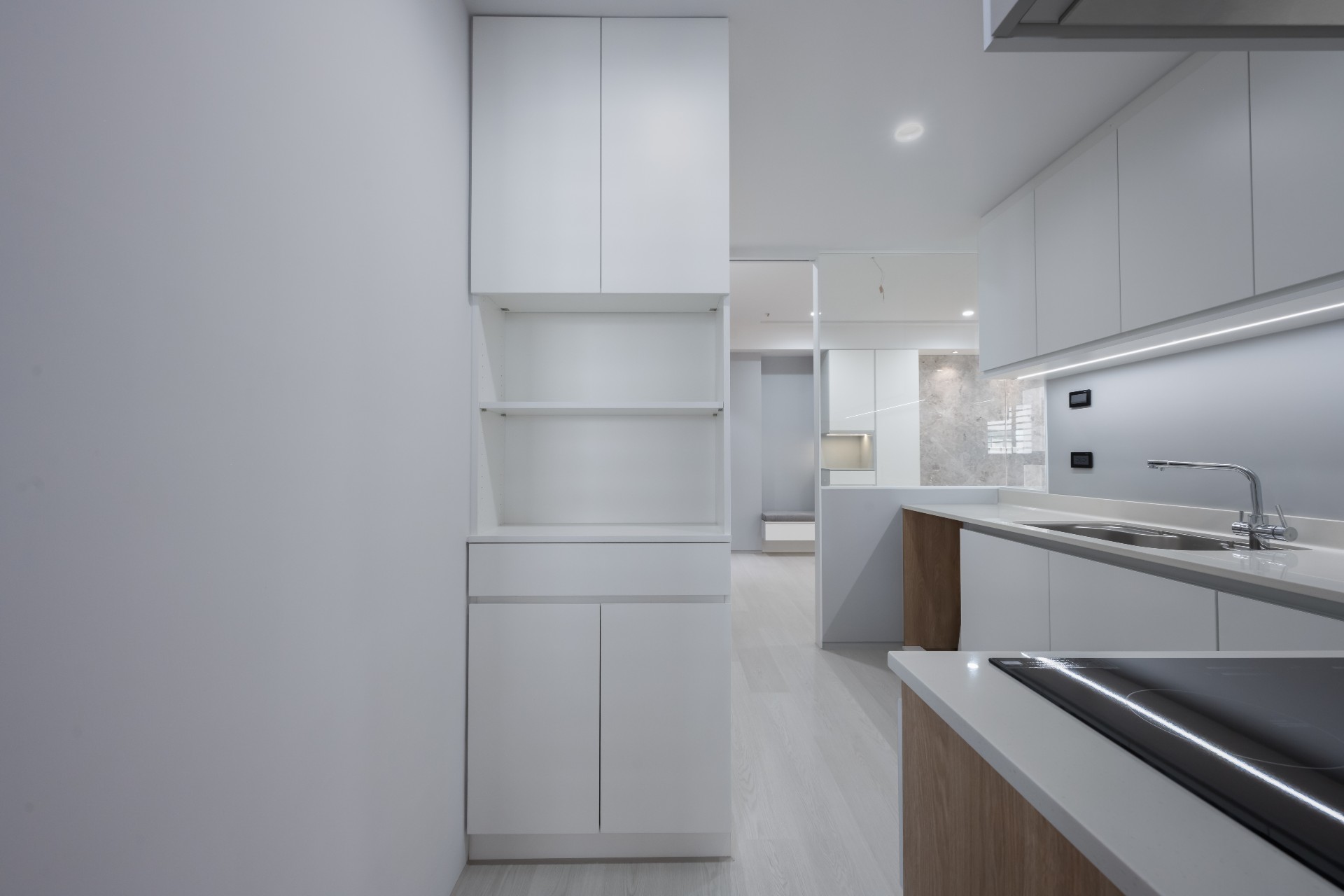 在廚房和書房的空間串連中,由於樑柱較低,在這部份藝瓦團隊也特別注意「維持樑的高度與給予管線較好的位置」,盡量不要再讓樑的部份有再降低的感受,減少屋主居住時的壓迫感。