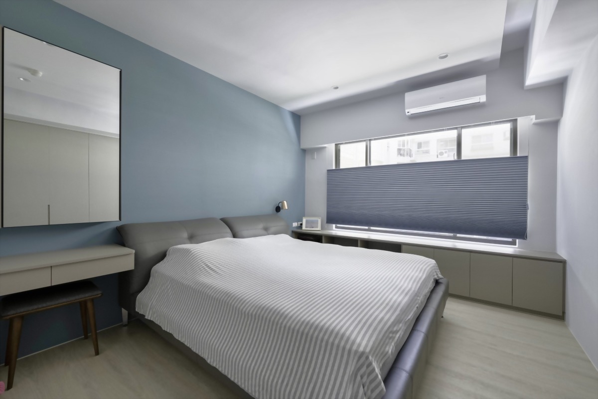 在床頭部份,以女主人最愛的藍色加上小型壁燈,成為最方便的床邊照明。
