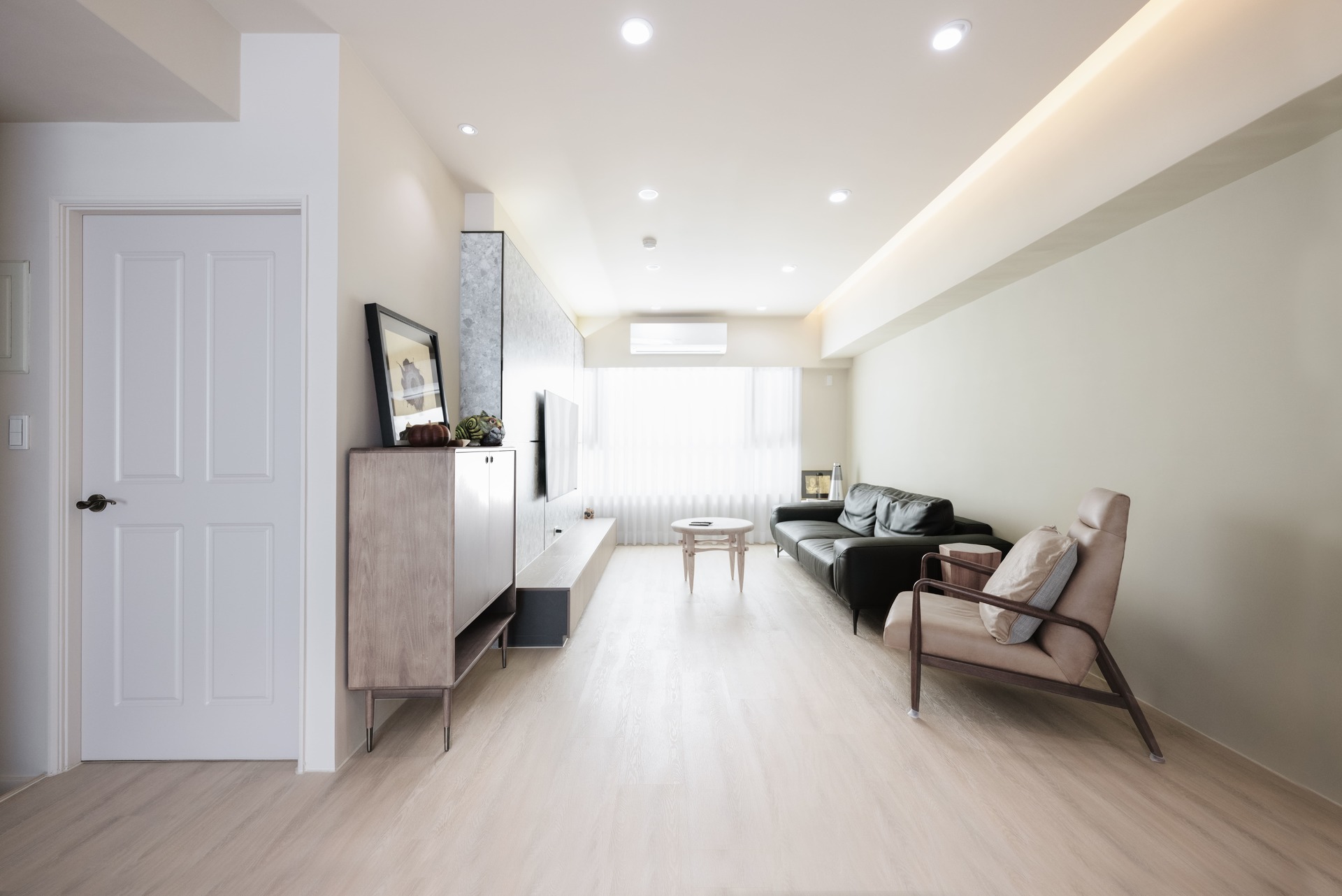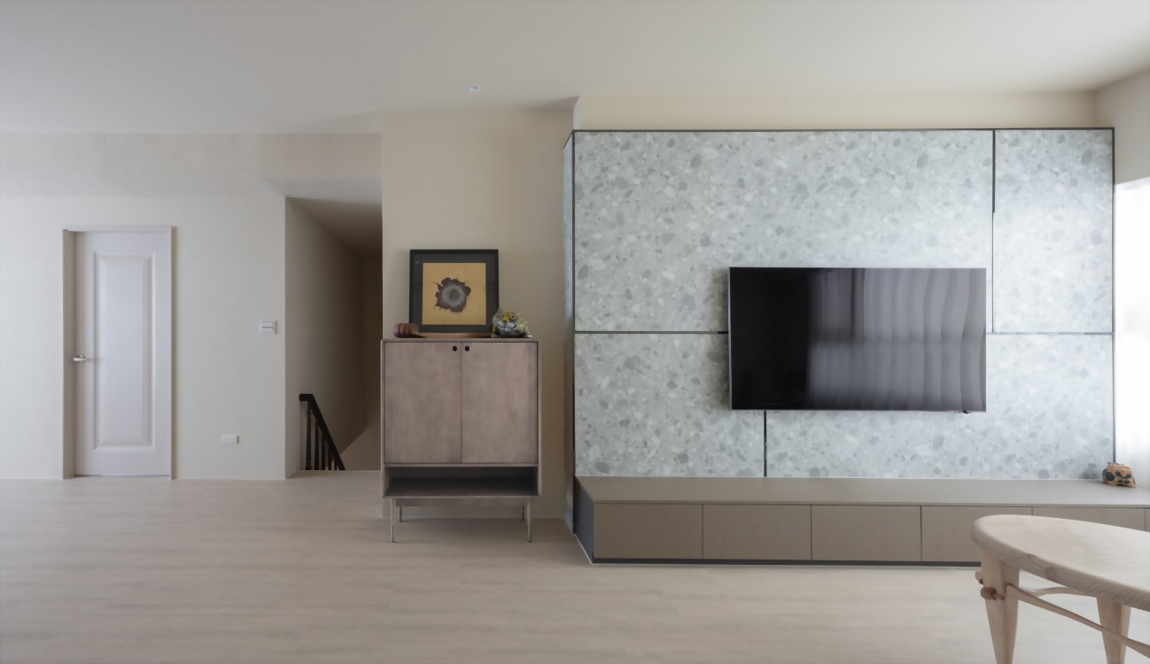 客廳整體空間也以簡約配置為主,將原木與大地素色系搭配,再以超受歡迎的奶油、淺木質等多種無色彩相互交錯。