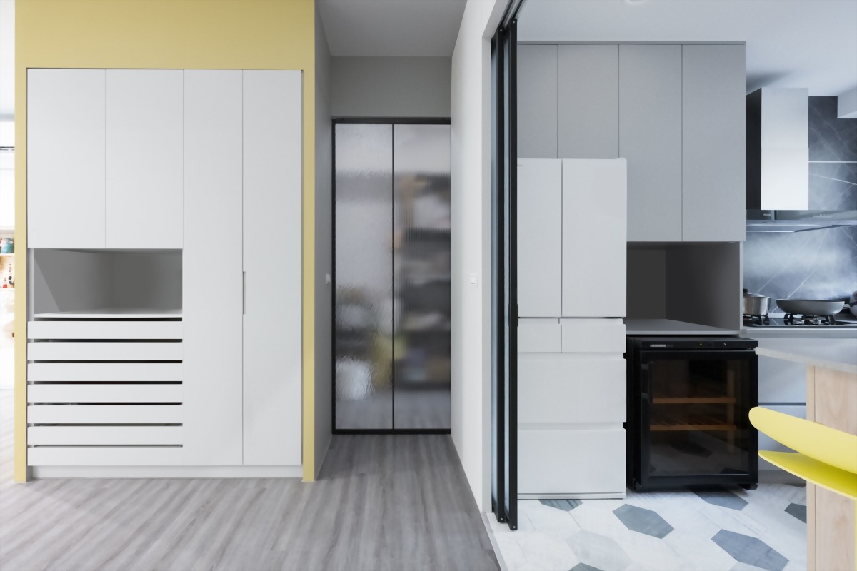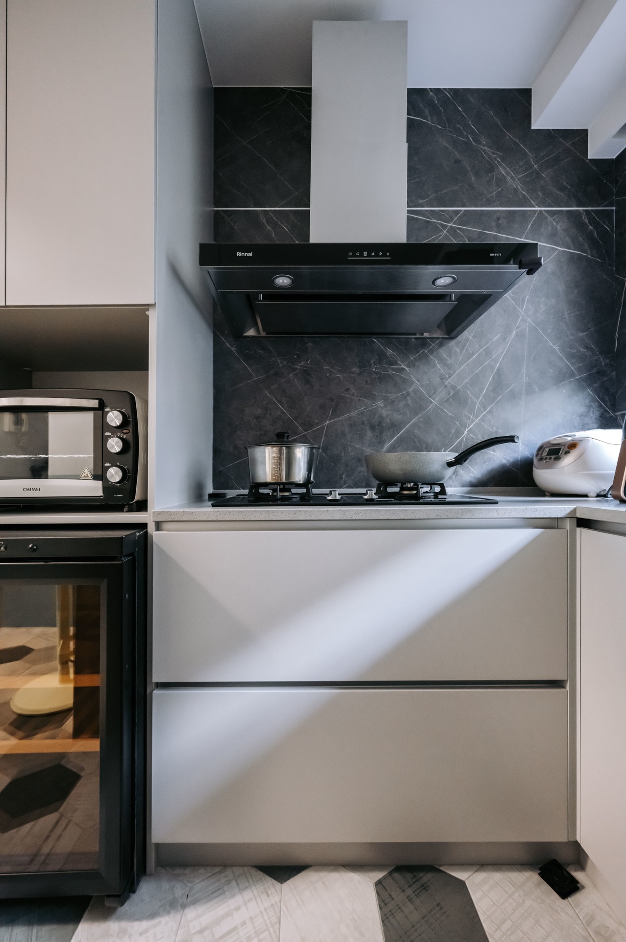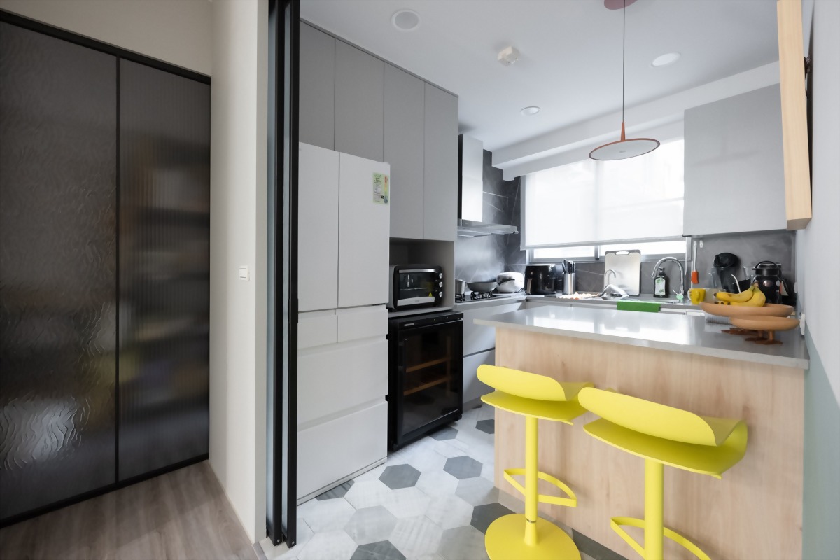 廚房設計除了符合設計氛圍,同樣也貼心的為屋主考量實用性及易清潔,整體地面以六角灰白拼磚為搭配,簡約舒適也相對耐髒。