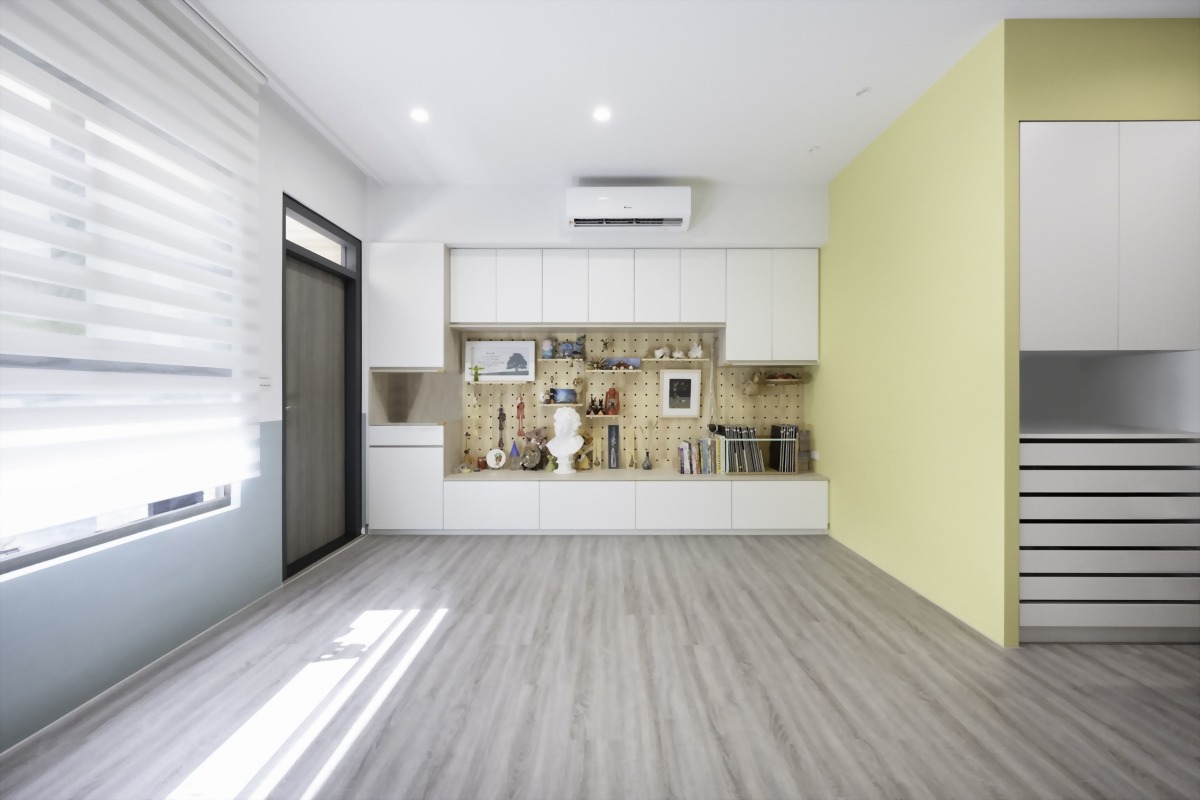 2. 畫室中的紙、顏料、作品、畫筆以及瓶瓶罐罐等,都必須整理整齊。在畫室收納部份,以可彈性運用的洞洞板做為主牆面,可放置收納物品並展示作品,配色氛圍也以清新簡單為主,搭配鮮鵝黃色的牆面,看起來明亮、愉悅。與調光簾映入室內的光線,形成一幅色彩與光線條融合的自然畫作。