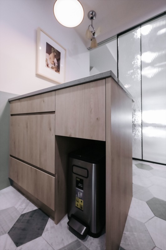 除了為屋主打造最佳料理動線、適合家人互動的多功能中島外;在中島下方也設計了可以藏起放置垃圾桶及收納機能俱全的空間。