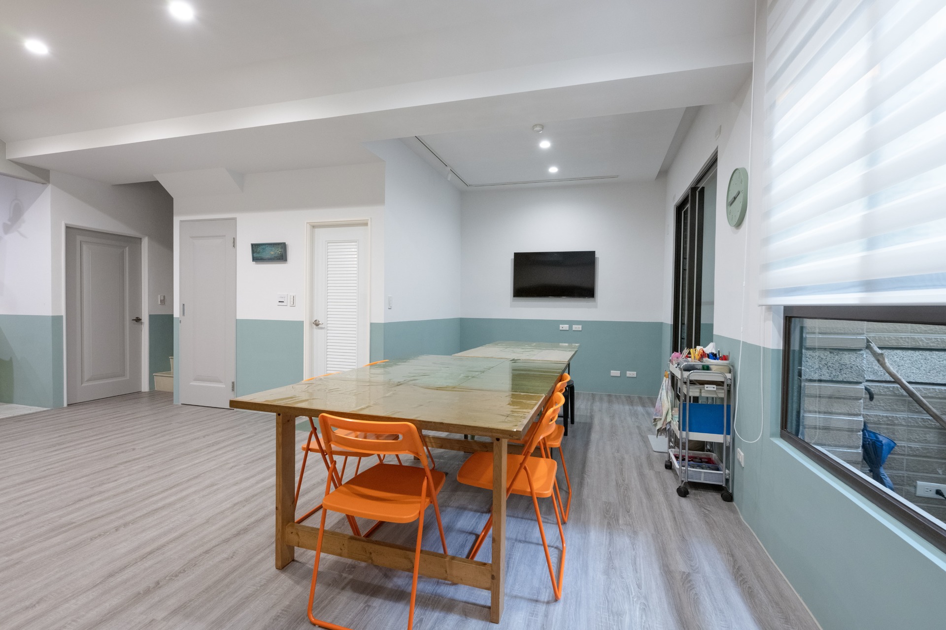 為了讓畫室達到好清理的目標,地板部份使用了超耐磨木地板。