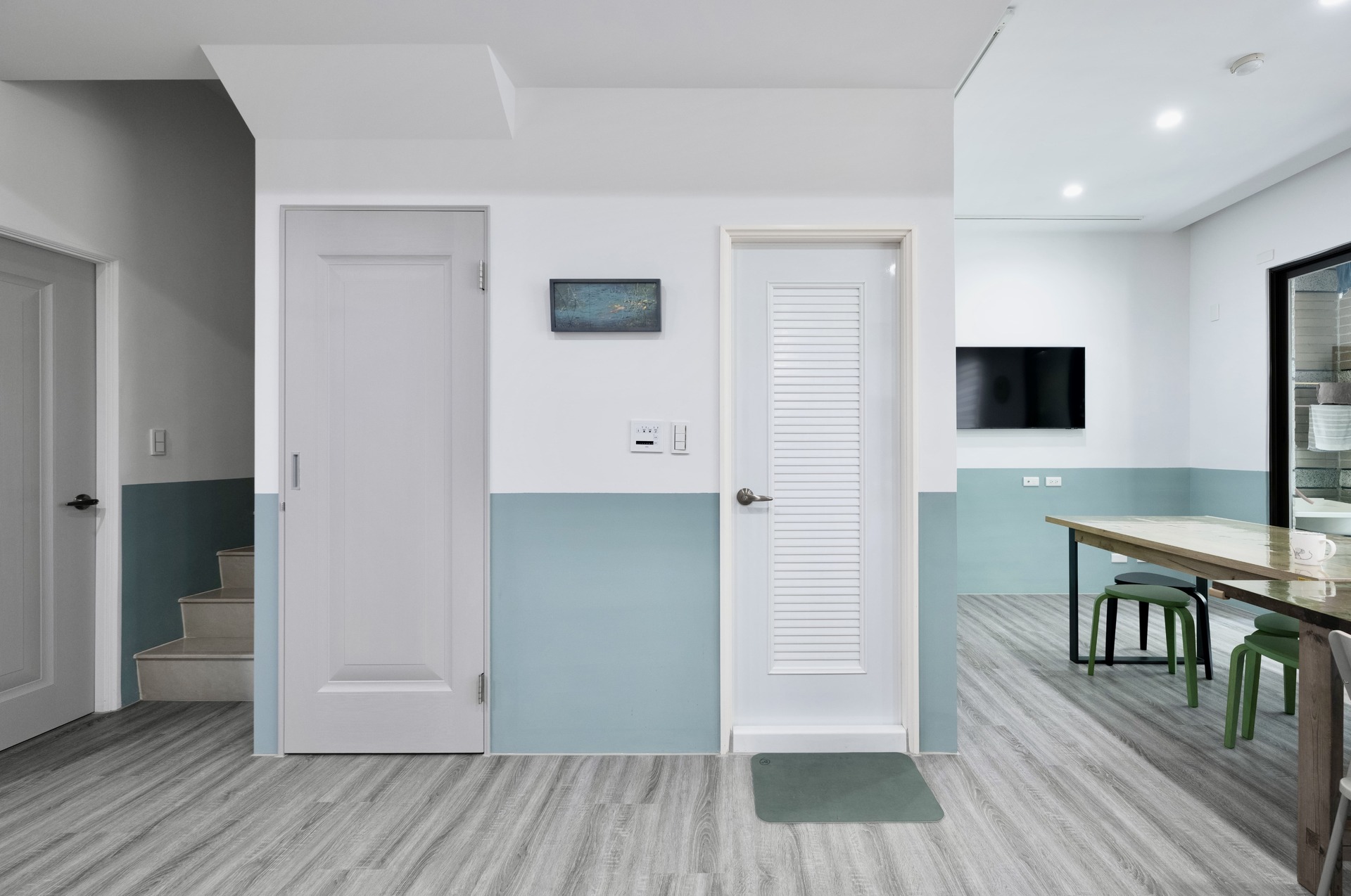 換個角度,在另一牆面的部份,也以特殊調配的明亮藍色,做出跳色及撞白色處理,呈現活潑的室內氛圍。