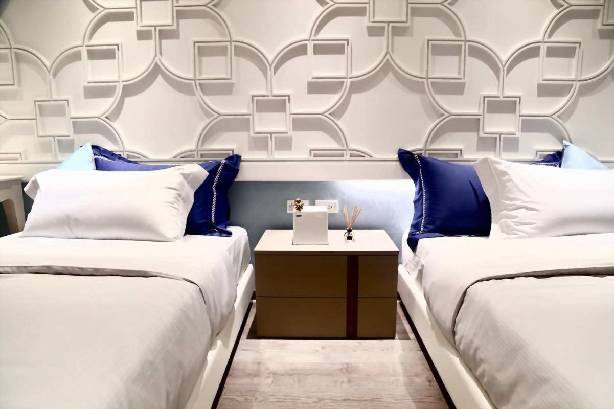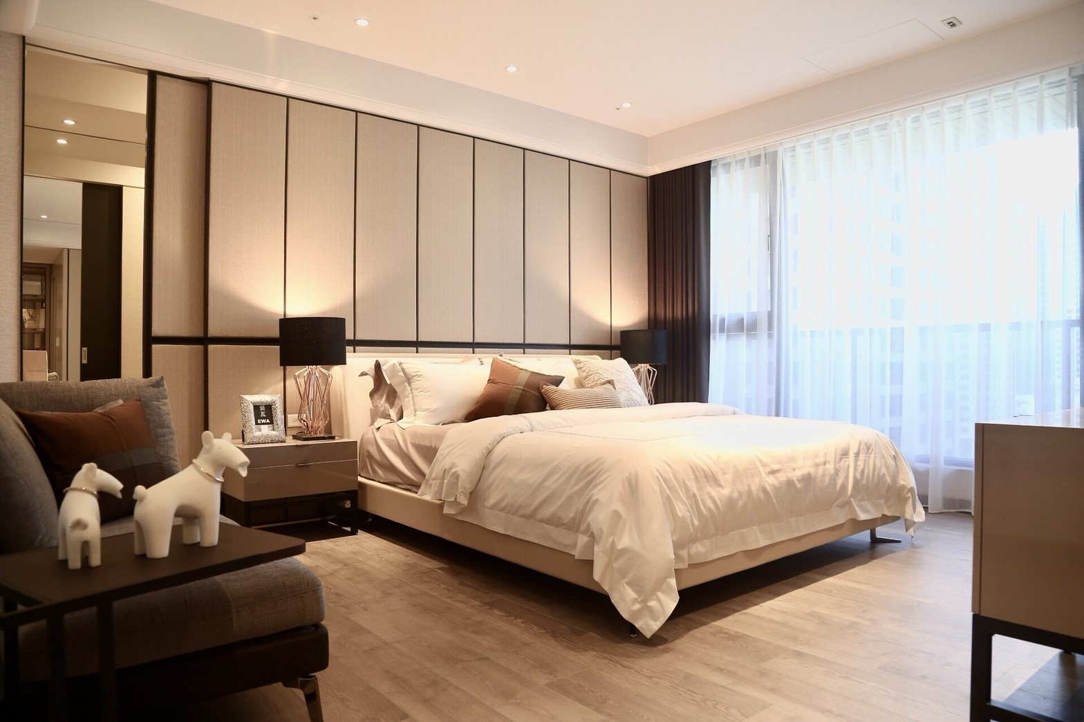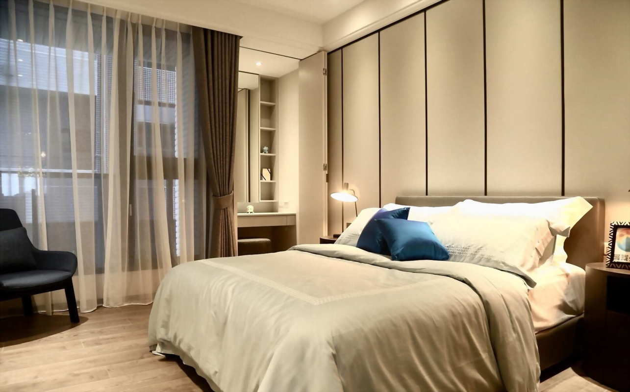 床頭簡單的線條、現代感的床頭燈,搭配鏡面牆,不僅讓室內空間設計更俐落,更提升臥室設計視覺的寬敞感,讓人感受放鬆的裝潢風格。