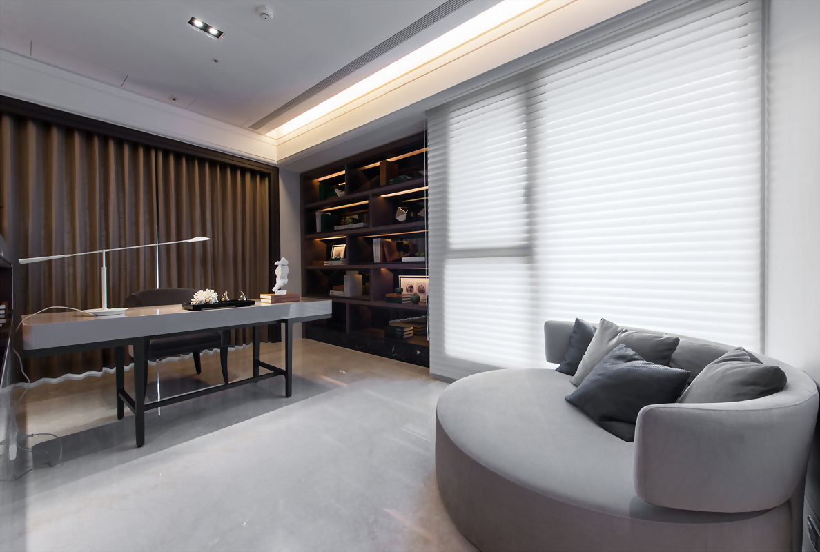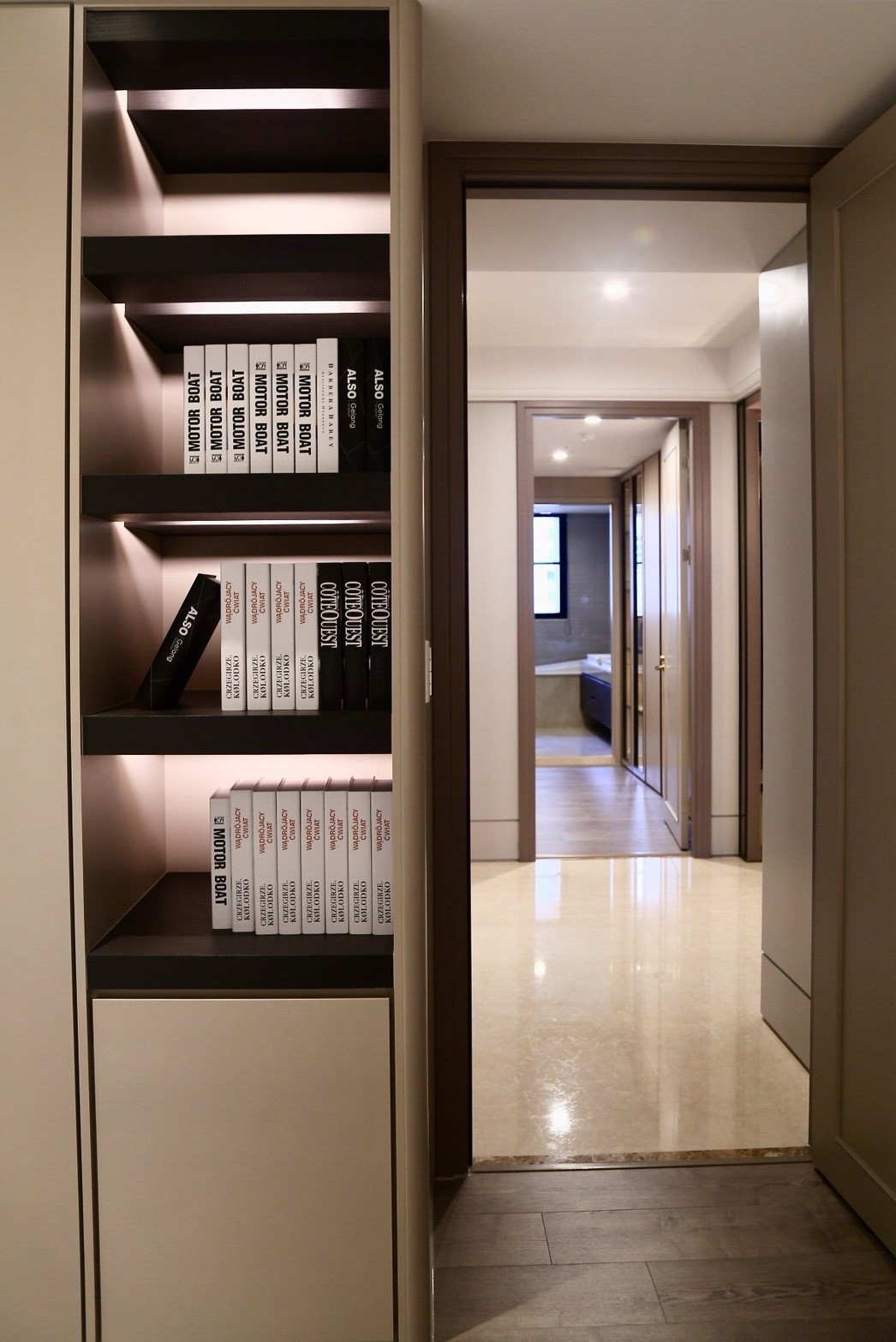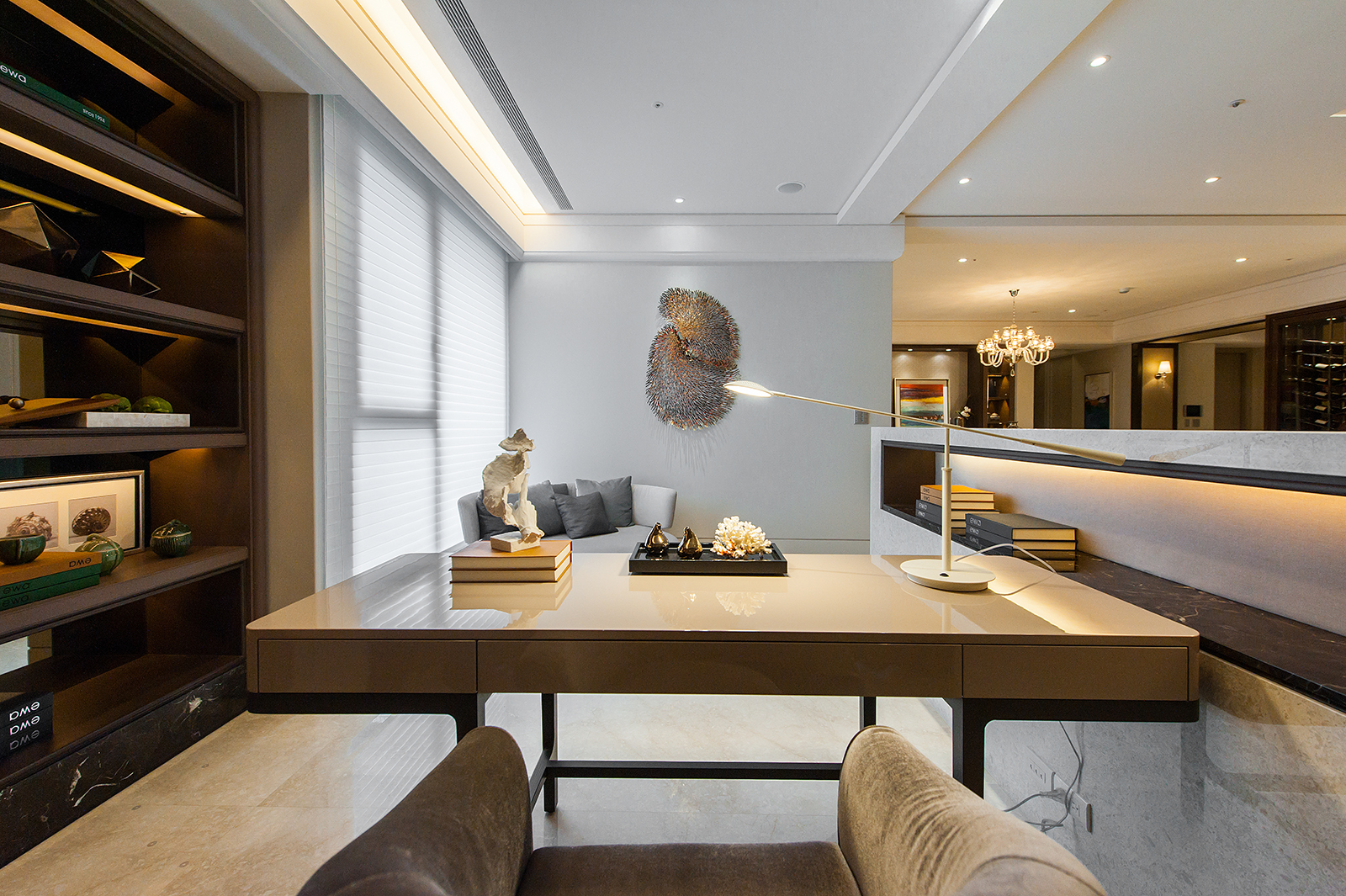 簡約的線條,新古典家具,裝潢設計搭配質感檯燈與飾品,側邊木質展示櫃與透光的大片窗戶呈現的住家設計,讓這一塊室內空間設計特別具有雅致的氛圍,雖坐落於客廳旁卻能充分體現空間規劃設計,感受與視覺上獨立空間的規劃。
