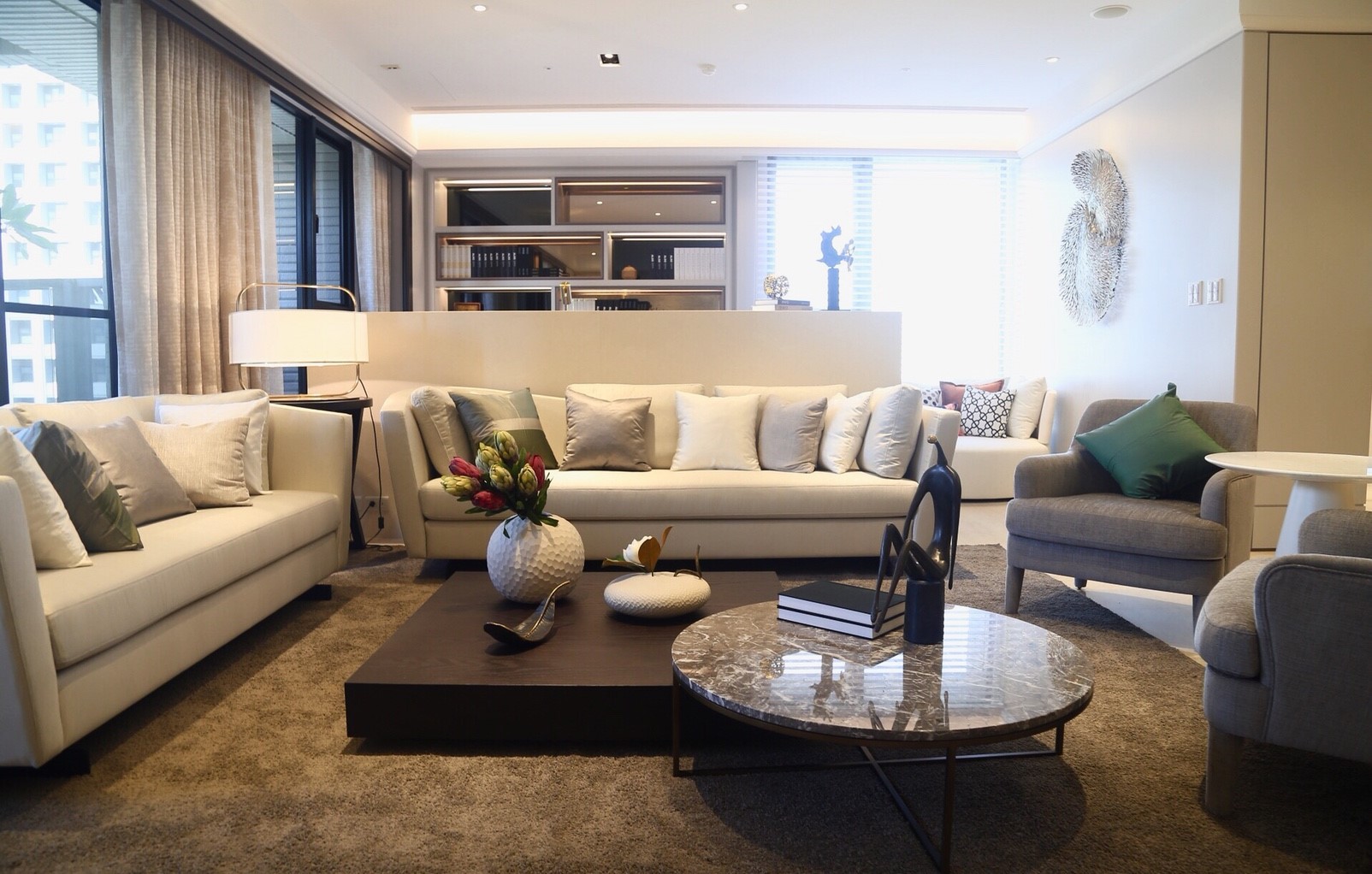 客廳室內設計裝潢風格採深色地毯搭配淺色沙發,在住家設計的家具飾品選擇上,以淺色淡雅裝潢設計配色為主,室內空間設計搭配大理石茶几與藝術感飾品,讓人充分感受優雅、溫馨的裝潢風格居家感受。