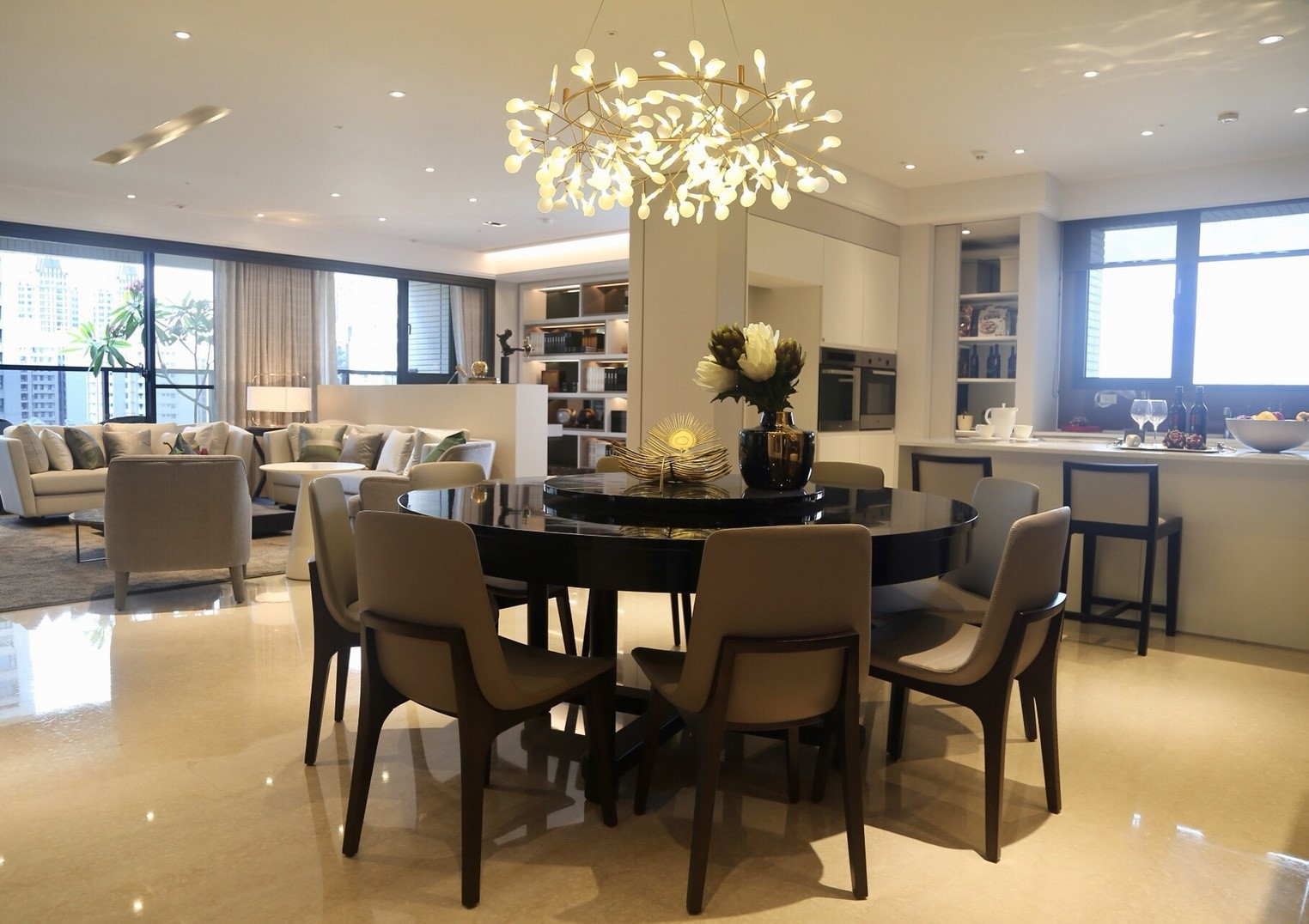 餐桌上方燈具設計燈飾點亮整體空間呈現出古典裝潢風格氛圍,讓人進入空間,就能感受溫柔婉約的空間室內設計,也讓開放式的居家空間,有一個主要的新古典視覺焦點。