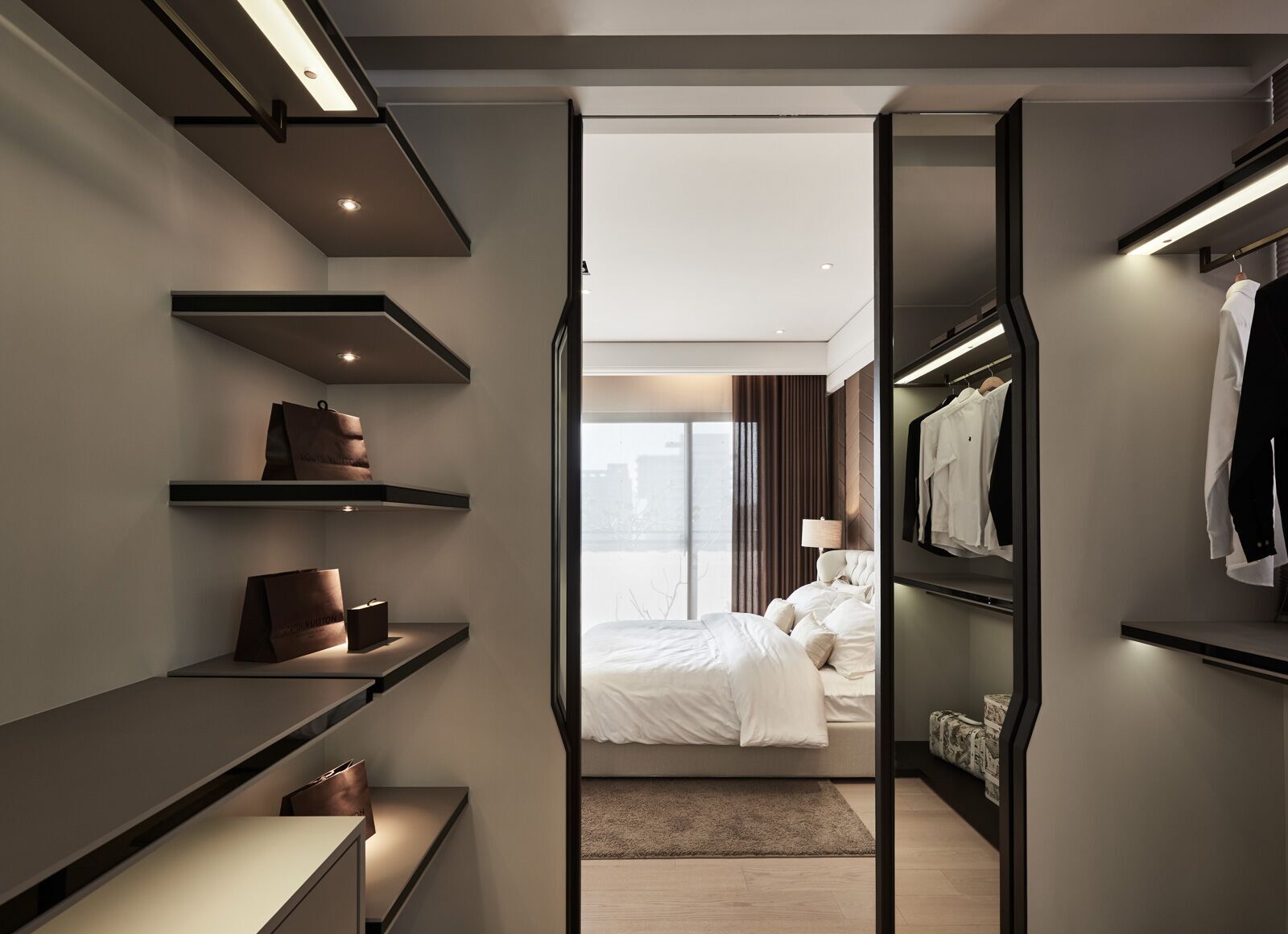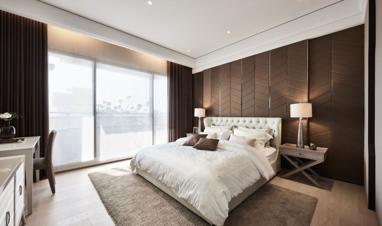 主臥設計以細膩的室內設計及裝潢風格選材,打造融合古典質感美及現代都會交織的室內空間設計。
