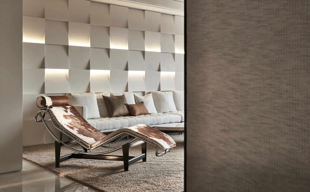 設計師透過方形白色塊體及光線的錯落有致,將沙發背牆建構出凹凸有致的韻律感。