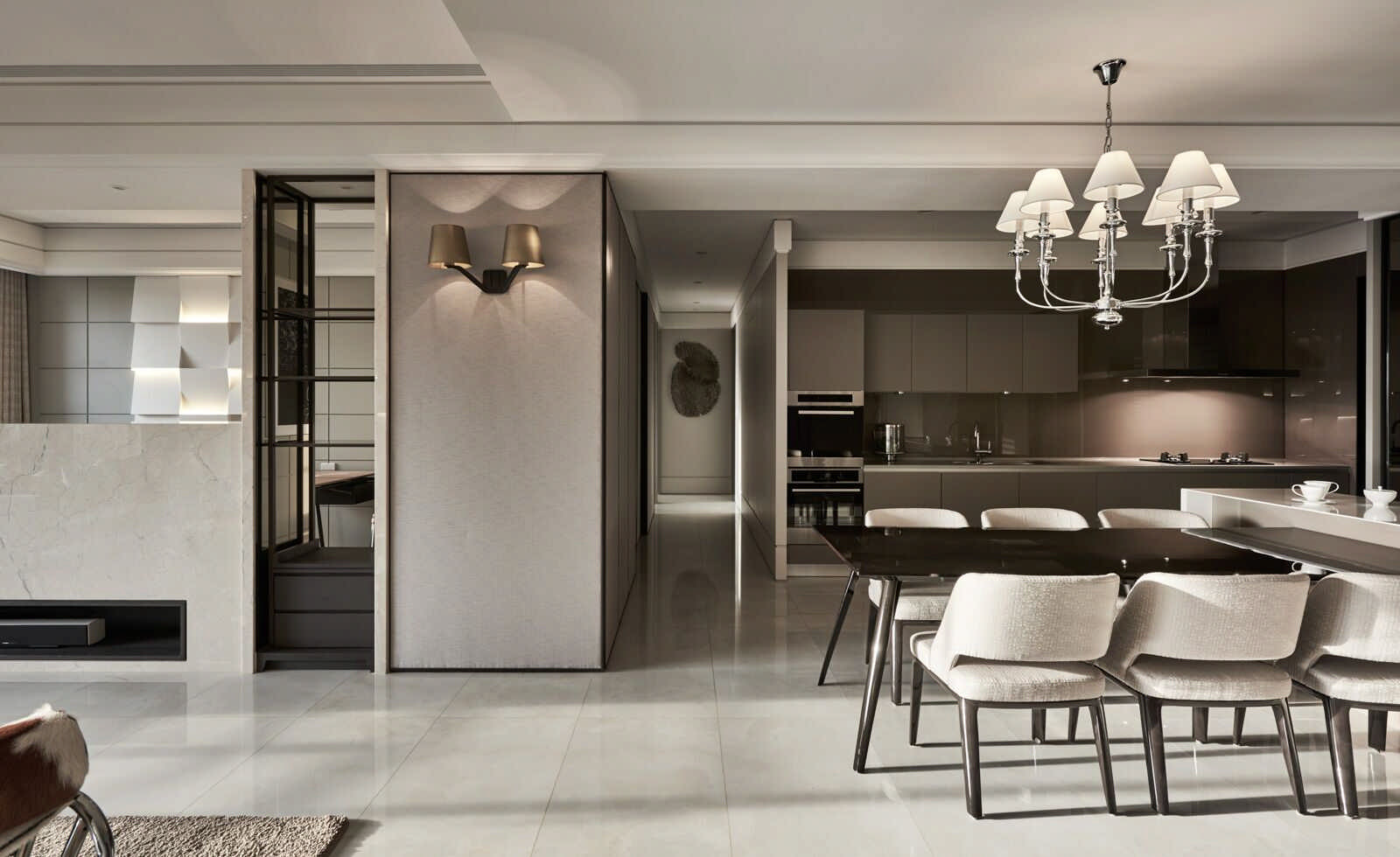 在動線規劃上採開放式設計,使客廳的自然光線得以流洩至餐廚區,將餐桌、中島及廚房三個區域連貫配置,圍塑家的情感交流及餐敘氛圍。